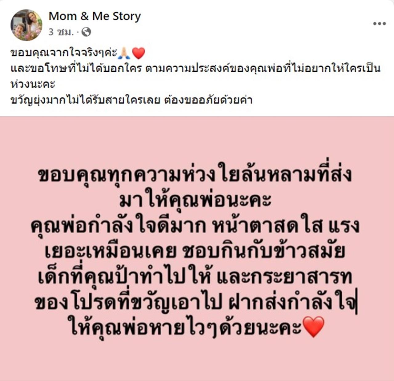 โดย ขวัญ ได้โพสต์อัปเดตอาการของคุณพ่อไว้ว่า "ขอบคุณทุกความห่วงใยล้นหลามที่ส่งมาให้คุณพ่อนะคะ คุณพ่อกำลังใจดีมาก หน้าตาสดใส แรงเยอะเหมือนเคย ชอบกินกับข้าวสมัยเด็กที่คุณป้าทำไปให้ และกระยาสารทของโปรดที่ขวัญเอาไป ฝากส่งกำลังใจให้คุณพ่อหายไวๆ ด้วยนะคะ"
