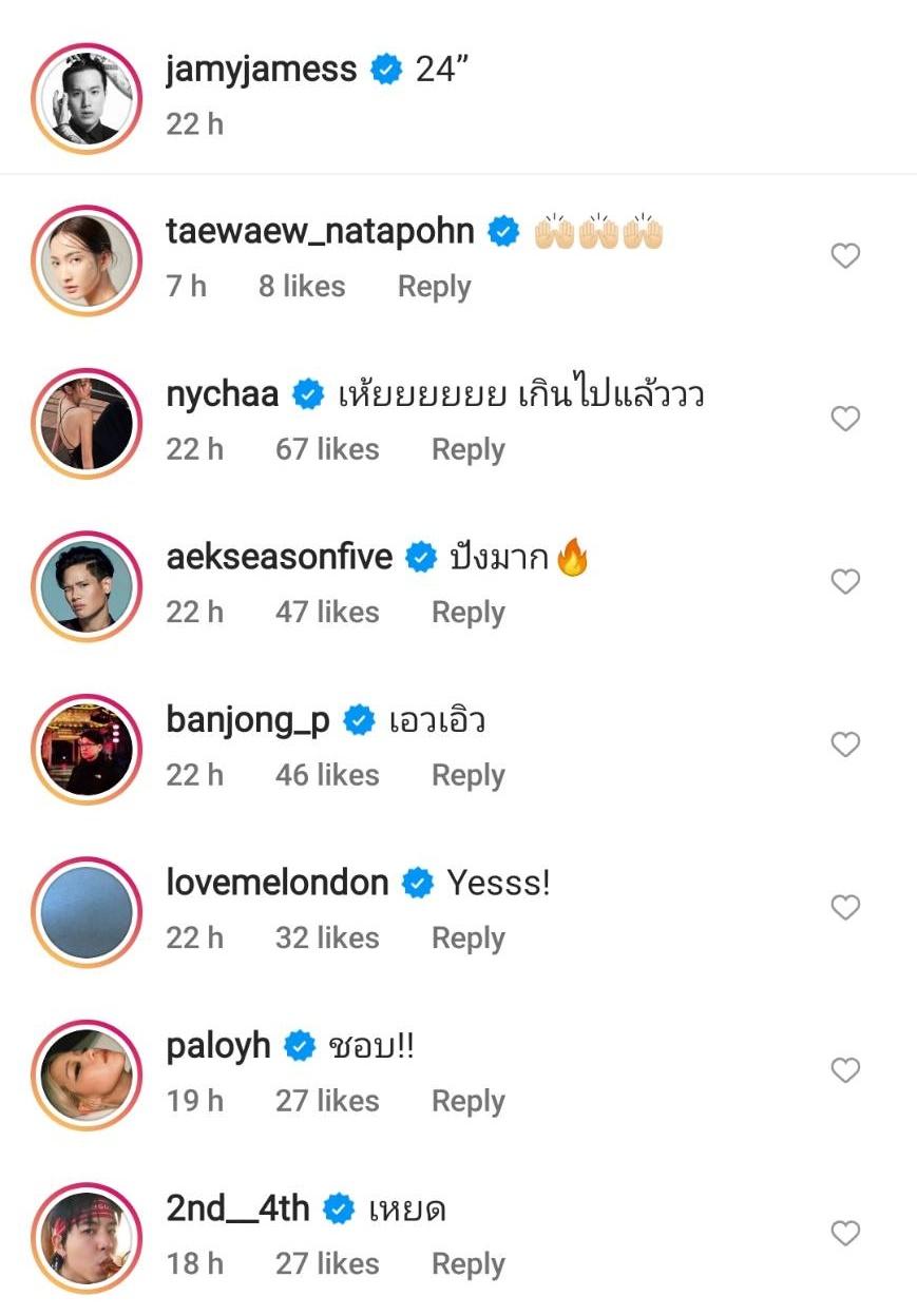 งานนี้ทำเอาแฟนๆ แห่กดไลค์นับแสน พร้อมทั้งส่งอีโมจิหัวใจและไฟลุก รวมถึงเพื่อนๆ ในวงการที่แสดงความคิดเห็น อาทิ แต้ว ณฐพร โพสต์อีโมจิยกมือ, ณิชา ณัฏฐณิชา “เห้ยยยยยย เกินไปแล้ววว”, เอก Season Five “ปังมาก”, โต้ง บรรจง “เอวเอิว”, พลอย หอวัง “ชอบ!!” ฯลฯ.