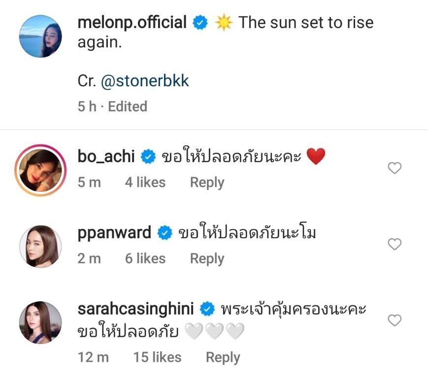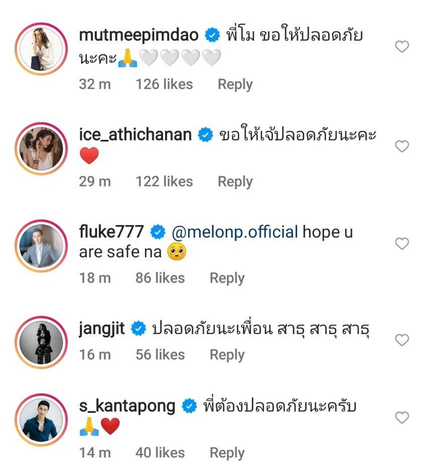 โดยหลังจากที่แฟนๆ ทราบข่าวของแตงโม นิดา ต่างก็เข้าไปคอมเมนต์ในไอจีส่วนตัวของแตงโมนับพันข้อความ โดยขอให้นักแสดงสาวรอดปลอดภัย ขอให้พระเจ้าคุ้มครอง รวมไปถึงคนบันเทิงที่ต่างคอมเมนต์อวยพรให้แตงโมปลอดภัย อาทิ เป้ย ปานวาด, โบ ชญาดา, ซาร่า คาซิงกินี, มัดหมี่ พิมพ์ดาว, ไอซ์ อธิชนัน, ฟลุค เกริกพล, แจง แจงจิต, เอส กันตพงศ์ ฯลฯ