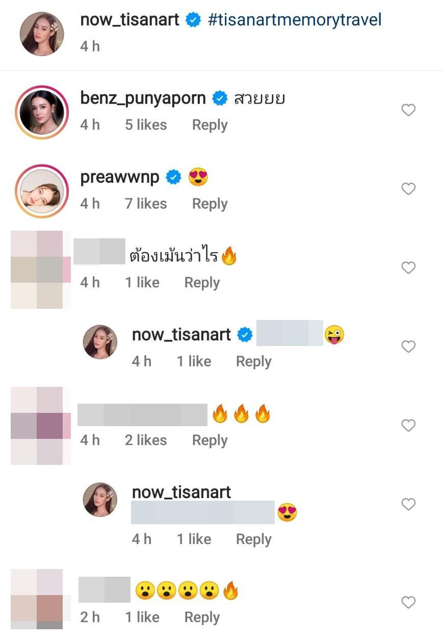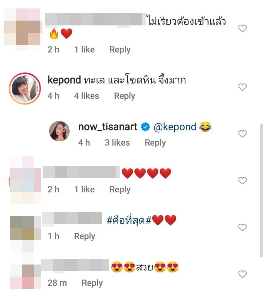 ท่ามกลางคอมเมนต์จากแฟนๆ ที่พร้อมใจส่งอีโมจิหัวใจและไฟลุก บ้างก็แซวว่าไม้เรียวต้องเข้าแล้ว รวมไปถึงคอมเมนต์จากคนในวงการบันเทิง อาทิ เบนซ์ ปุณยาพร “สวยยย”, เปรี้ยว ทัศนียา ส่งอีโมจิตาเป็นประกายหัวใจ รวมไปถึง เก๋ ผู้จัดการส่วนตัว ที่บอกว่า “ทะเล และโขดหิน จึ้งมาก”.