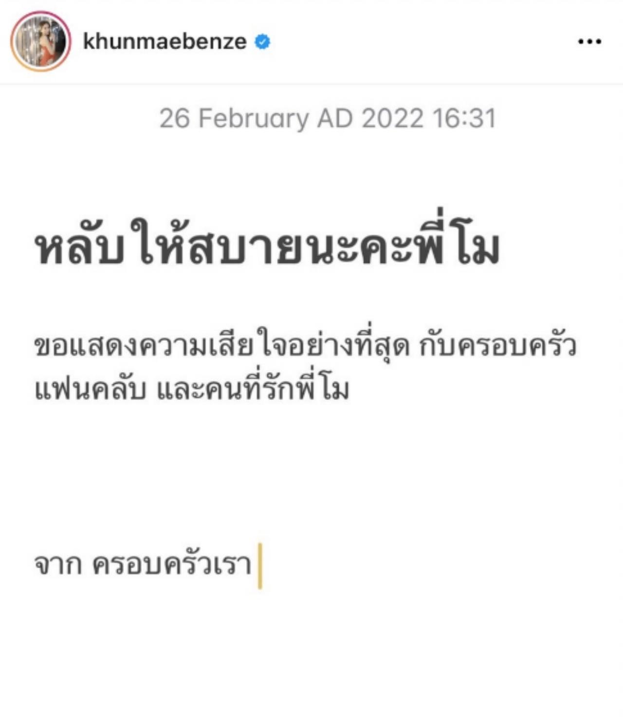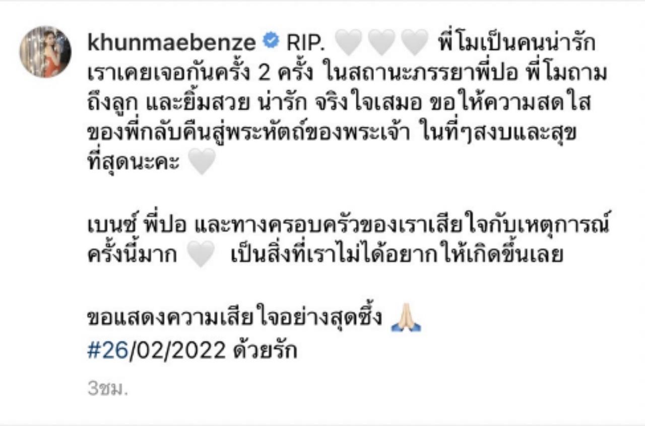 เบนซ์ พี่ปอ และทางครอบครัวของเราเสียใจกับเหตุการณ์ครั้งนี้มาก เป็นสิ่งที่เราไม่ได้อยากให้เกิดขึ้นเลย ขอแสดงความเสียใจอย่างสุดซึ้ง #26/02/2022 ด้วยรัก"