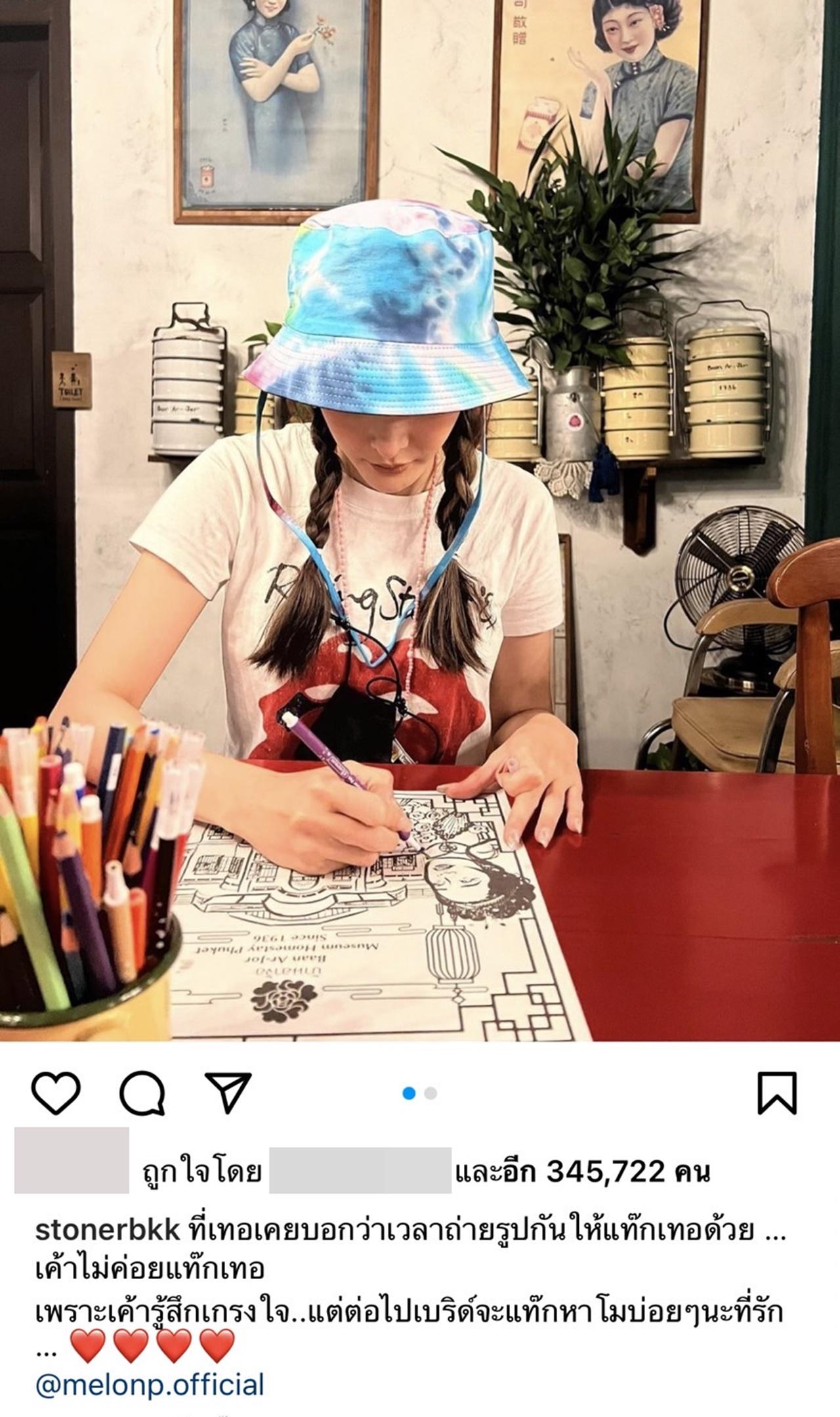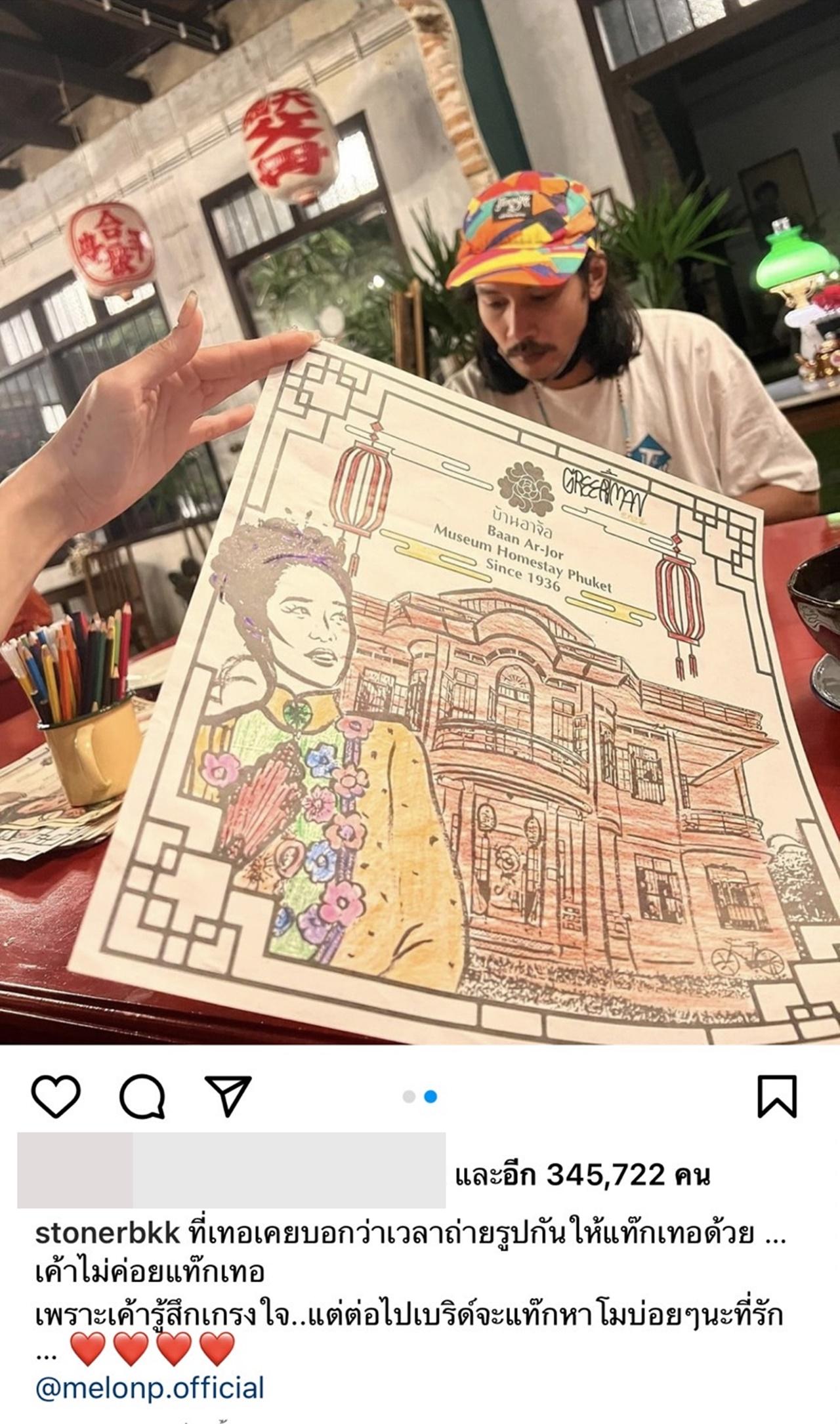 "ที่เทอเคยบอกว่าเวลาถ่ายรูปกันให้แท๊กเทอด้วย …เค้าไม่ค่อยแท๊กเทอเพราะเค้ารู้สึกเกรงใจ..แต่ต่อไปเบริด์จะแท๊กหาโมบ่อยๆ นะที่รัก …@melonp.official" นอกจากนี้ เบิร์ด ยังได้โพสต์ไอจีสตอรี่รูปที่แตงโมแอบถ่ายเอาไว้ตอนที่เจ้าตัวหลับอีกด้วย