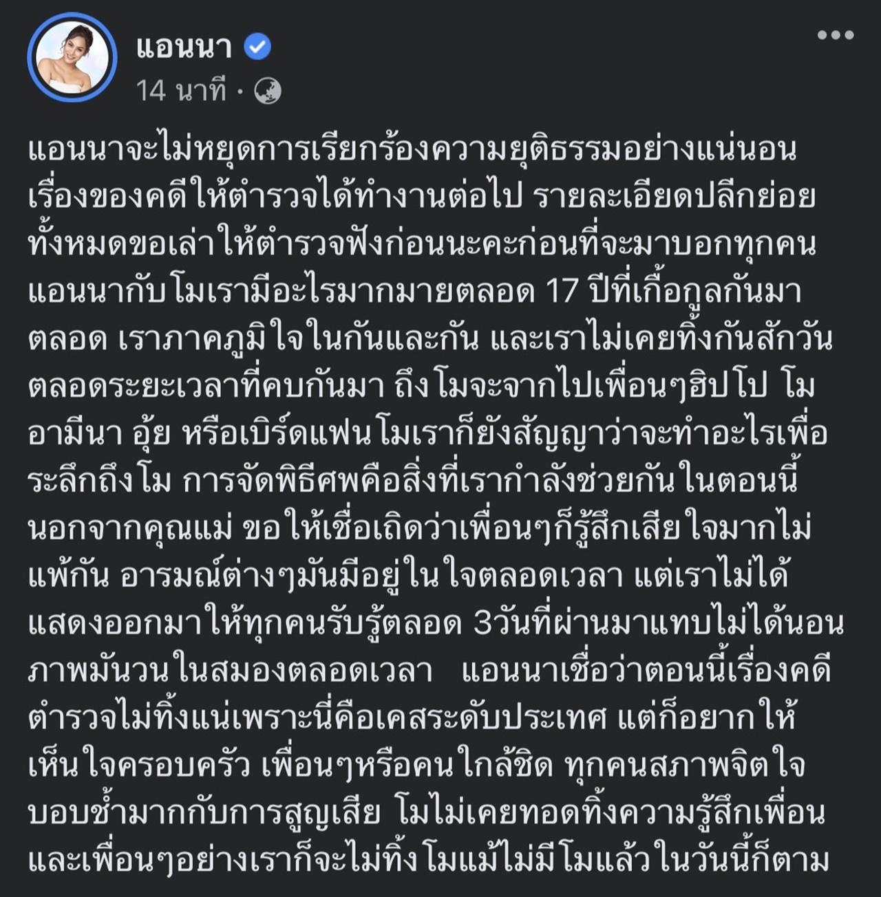 แต่ก็อยากให้เห็นใจครอบครัว เพื่อนๆ หรือคนใกล้ชิด ทุกคนสภาพจิตใจบอบช้ำมากกับการสูญเสีย โมไม่เคยทอดทิ้งความรู้สึกเพื่อน และเพื่อนๆ อย่างเราก็จะไม่ทิ้งโมแม้ไม่มีโมแล้วในวันนี้ก็ตาม".