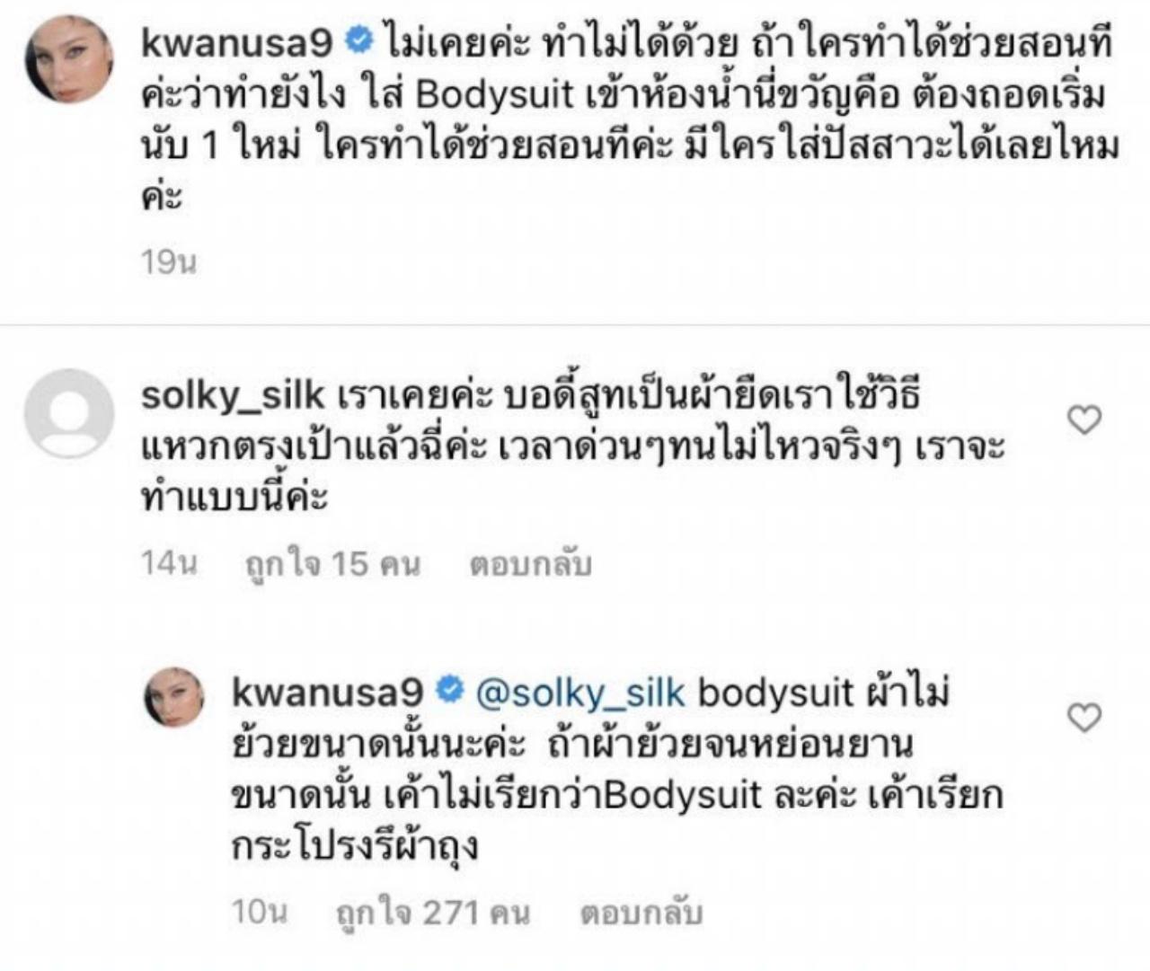 โดยมีคนเมนต์กลับว่า เราเคยค่ะ บอดี้สูทเป็นผ้ายืด เราใช้วิธีแหวกเป้าแล้วฉี่ค่ะ เวลาด่วนๆ ทนไม่ไหวจริงๆ เราทำแบบนี้ค่ะ ขวัญ อุษามณี รีบเมนต์กลับไปว่า ผ้าไม่ย้วยขนาดนั้นนะคะ ถ้าผ้าย้วยจนหย่อนยานขนาดนั้น เค้าไม่เรียกว่า bodysuit ละค่ะ เค้าเรียกกระโปรงรึผ้าถุง