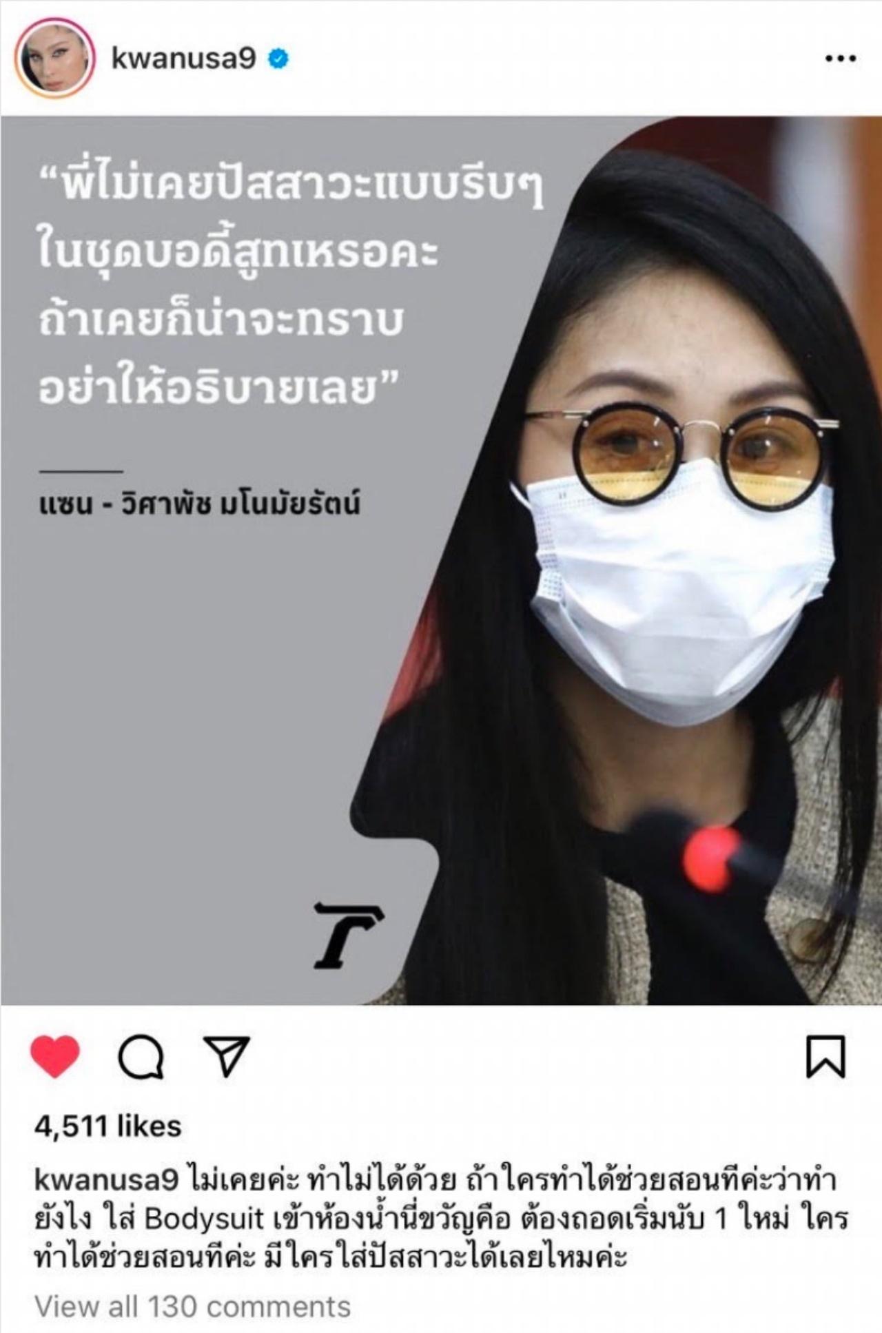 นางเอกดัง ขวัญ อุษามณี ไวทยานนท์ ได้โพสต์ภาพที่มีข้อความของแซน ดังนี้ "พี่ไม่เคยปัสสาวะแบบรีบๆ ในชุดบอดี้สูทเหรอคะ ถ้าเคยก็น่าจะทราบ อย่าให้อธิบายเลย"
