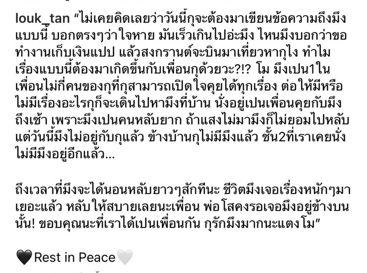 “ไม่เคยคิดเลยว่าวันนี้กุจะต้องมาเขียนข้อความถึงมึงแบบนี้ บอกตรงๆ ว่าใจหาย มันเร็วเกินไปอ่ะมึง ไหนมึงบอกว่าขอทำงานเก็บเงินแปป แล้วสงกรานต์จะบินมาเที่ยวหากุไง ทำไมเรื่องแบบนี้ต้องมาเกิดขึ้นกับเพื่อนกุด้วยวะ?!?