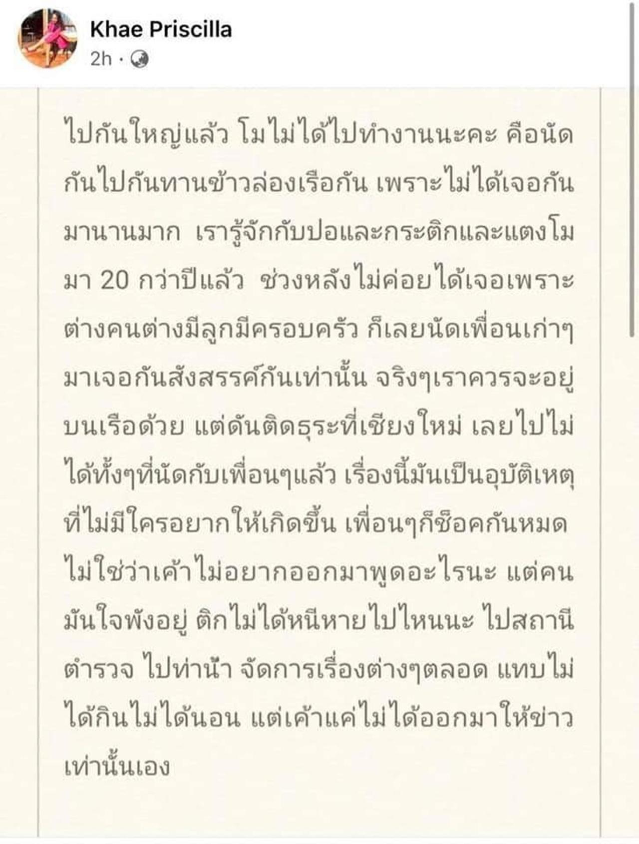 มีเฟซบุ๊กที่ใช้ชื่อว่า Khae Priscilla ได้อ้างว่าเป็นเพื่อนของ แตงโม นิดา และ กระติก ผู้จัดการส่วนตัว ว่าได้รู้จักกันมานานกว่า 20 ปี โดยได้ระบุว่า ตัวเองนั้นจะต้องอยู่บนเรือกับแตงโมด้วย แต่ติดธุระ พร้อมกับเผยอีกมุมของ กระติก ที่ไม่มีใครรู้ให้ฟังว่า