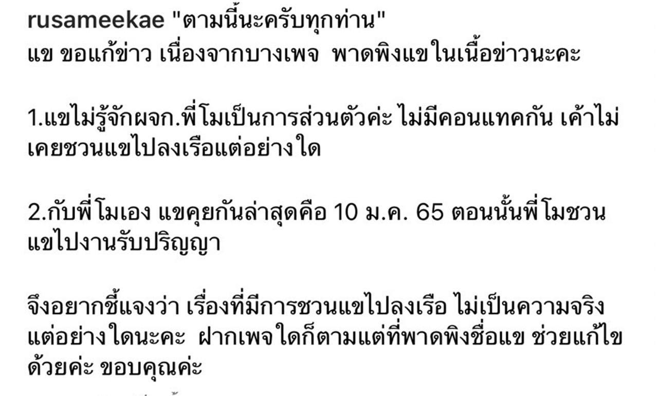 จึงอยากชี้แจงว่า เรื่องที่มีการชวนแขไปลงเรือ ไม่เป็นความจริงแต่อย่างใดนะคะ ฝากเพจใดก็ตามแต่ที่พาดพิงชื่อแข ช่วยแก้ไขด้วยค่ะ ขอบคุณค่ะ"