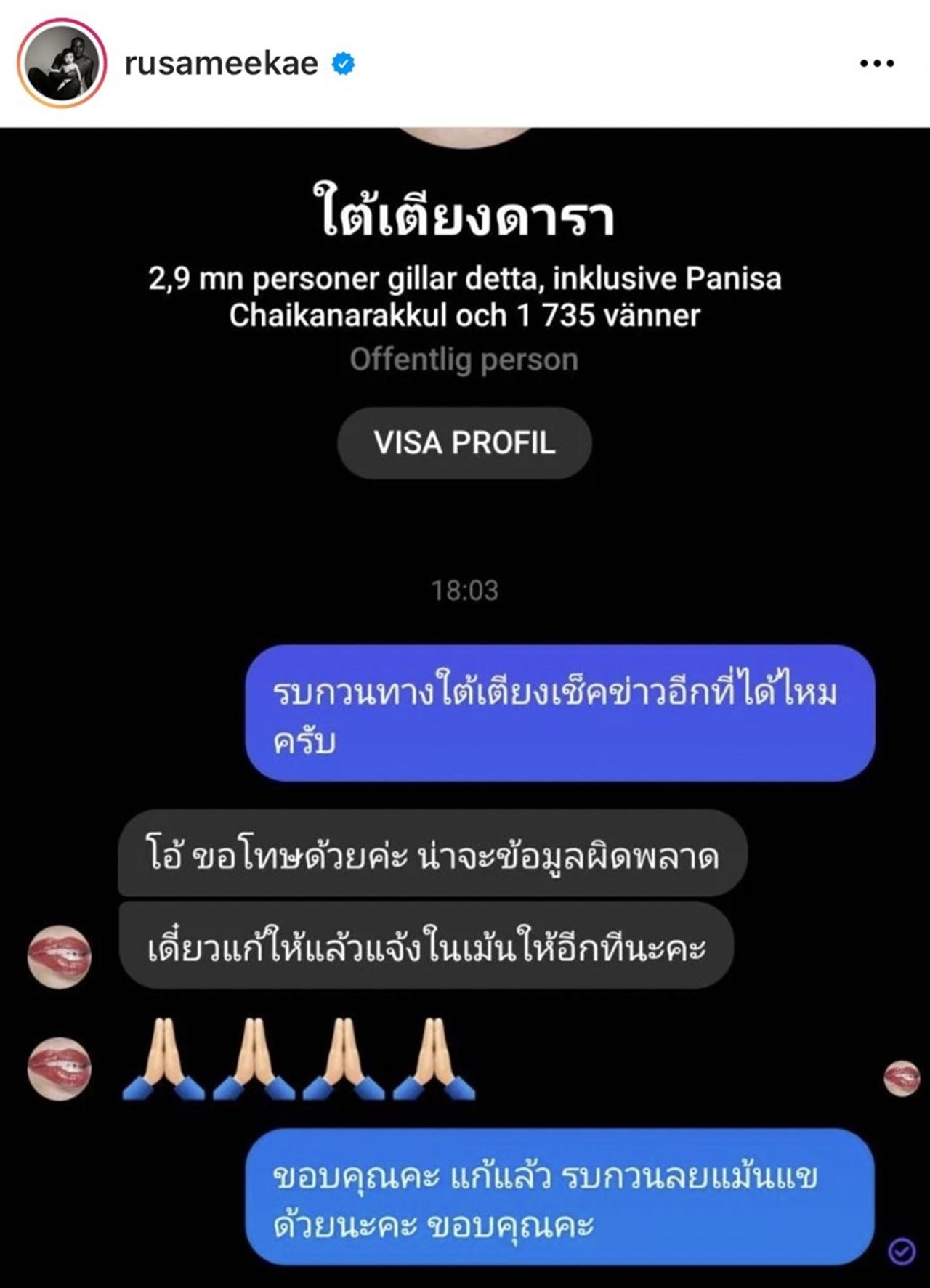 พร้อมกับเขียนแคปชั่นว่า "ตามนี้นะครับทุกท่าน" แข ขอแก้ข่าว เนื่องจากบางเพจ พาดพิงแขในเนื้อข่าวนะคะ