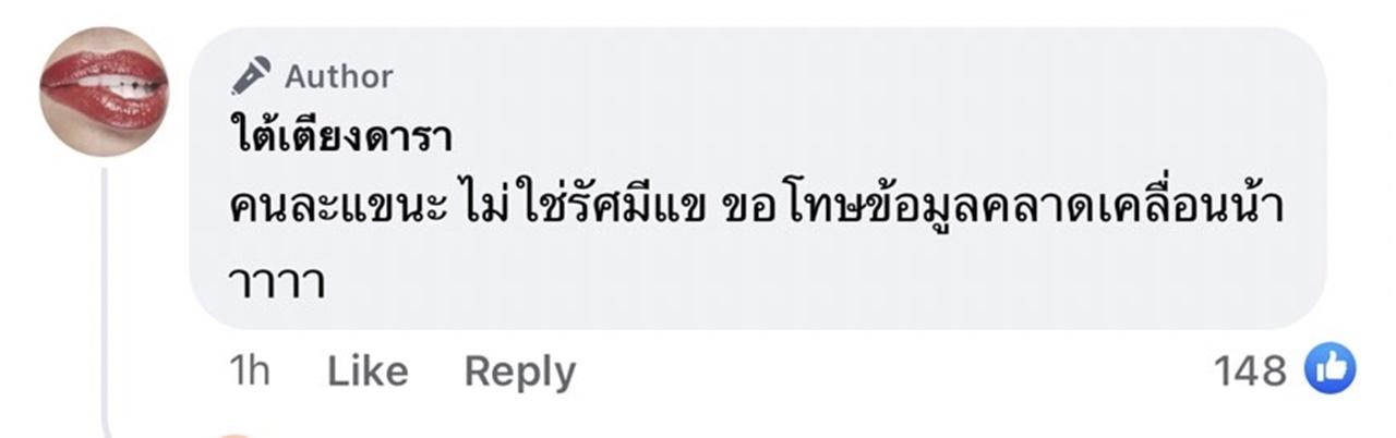 ส่วนทางด้านเพจใต้เตียงดาราก็ได้คอมเมนต์แก้ไขให้กับ รัศมีแข ว่า "คนละแขนะ ไม่ใช่รัศมีแข ขอโทษข้อมูลคลาดเคลื่อนน้าาาา".