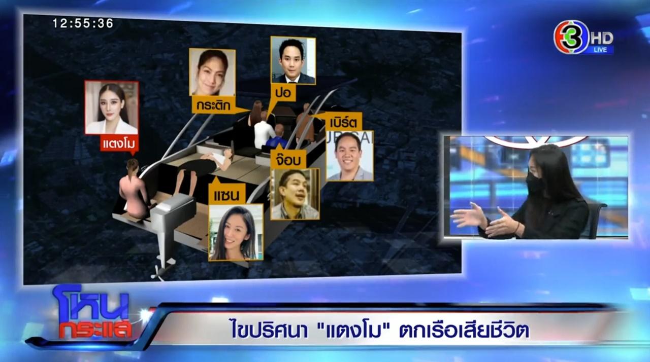 แซน : ใช่ค่ะ ขอกูฉี่แป๊บนึงนะ แล้วเขาก็นั่งเลย แซนก็ไม่ได้ทันที่จะบอกให้หยุดเรือหรืออะไร แล้วตอนเขาจะนั่ง เขาก็จับขาแซน พอเขานั่งแซนก็ไม่ได้สังเกตเพราะเขาทำธุระส่วนตัวเขาจะจับอะไรแซน ตอนนั้นก็นั่งเล่นมือถือไปเรื่อย
