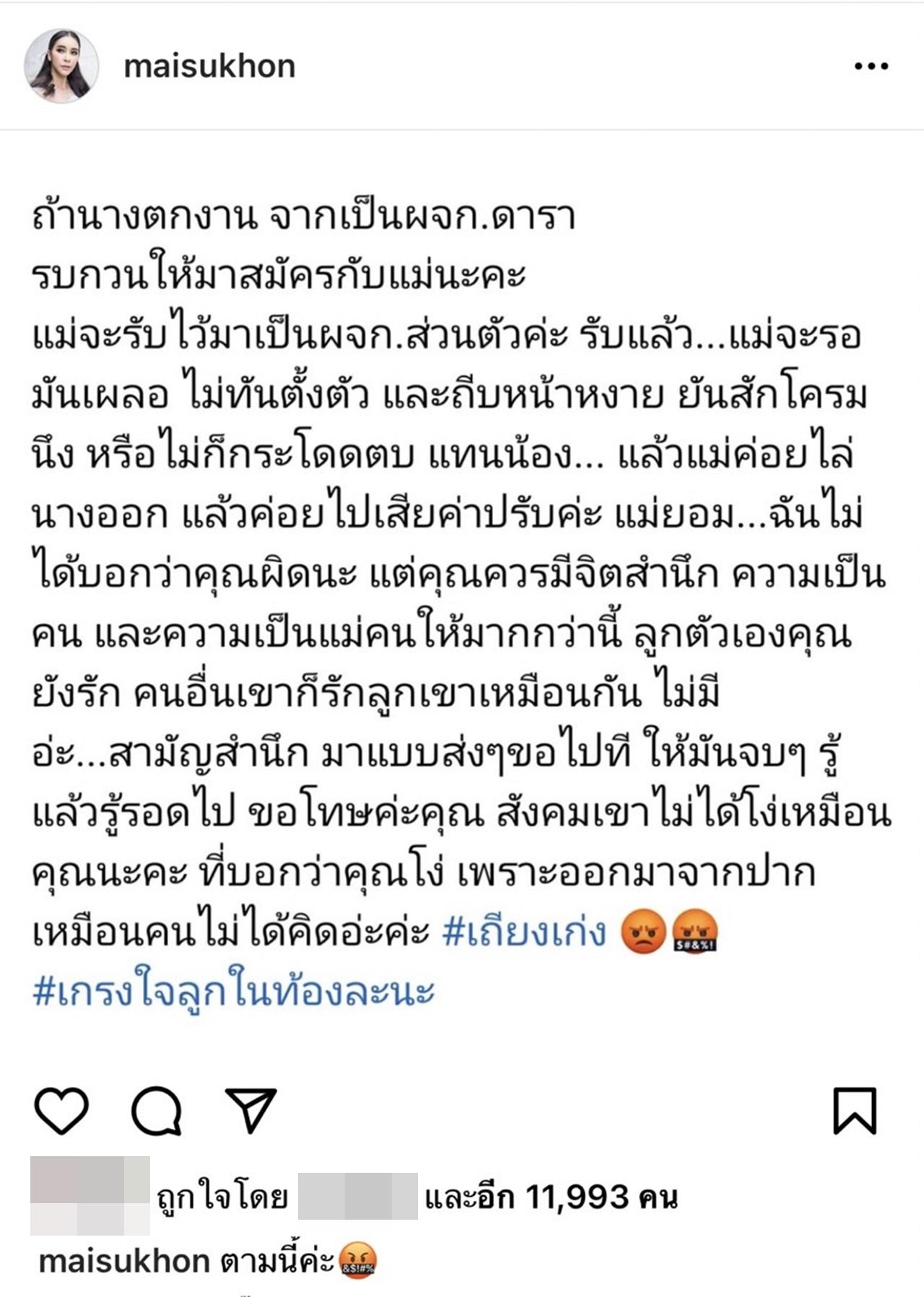 ล่าสุด ใหม่ สุคนธวา ก็ได้โพสต์ข้อความผ่านอินสตาแกรมของตัวเอง หลังรับไม่ได้กับคำตอบที่ได้ยินจากปากของ กระติก พร้อมแสดงความคิดเห็นในฐานะคนเป็นแม่เหมือนกัน โดยบอกว่า "มือ เท้า หน้า ร้อนไปหมด ขึ้นสุดๆ อีแม่ นี่เกรงใจว่าตัวเองท้องอยู่นะ ไม่งั้นล่ะ อาละวาดกว่านี้อีก"