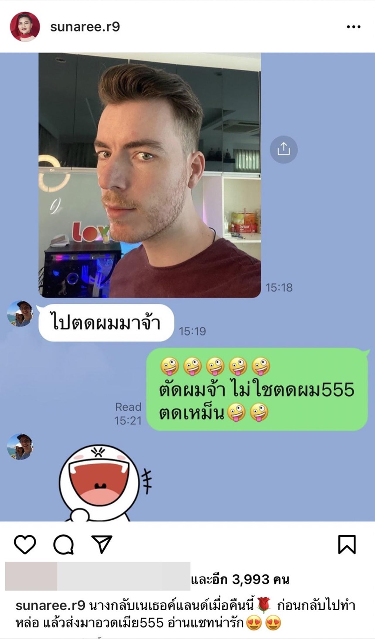 ทั้งนี้ สุนารี ยังได้เขียนแคปชั่นเอาไว้ว่า "นางกลับเนเธอค์แลนด์เมื่อคืนนี้ ก่อนกลับไปทำหล่อ แล้วส่งมาอวดเมีย555 อ่านแชทน่ารัก".