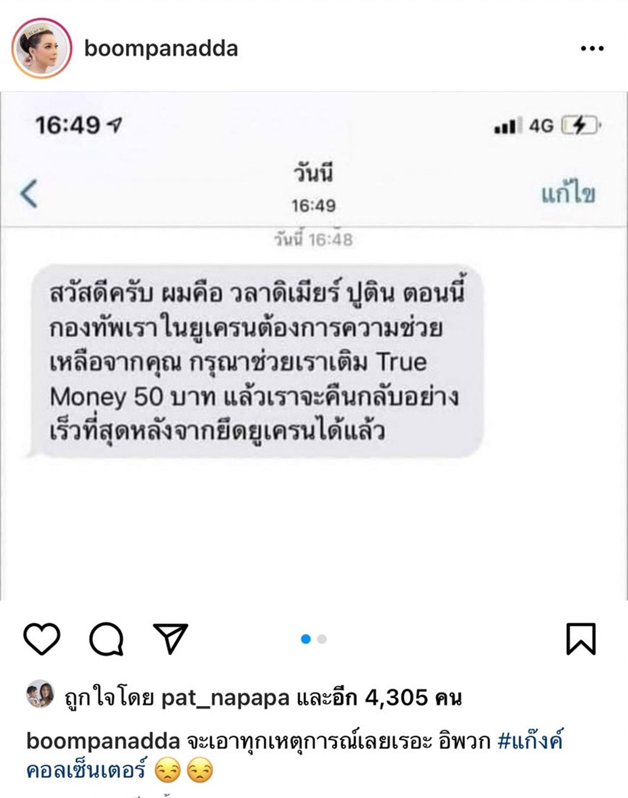 ซึ่งข้อความที่ส่งมาเขียนเอาไว้ว่า "สวัสดีครับ ผมคือ วลาดิเมียร์ ปูติน ตอนนี้กองทัพเราในยูเครนต้องการความช่วยเหลือจากคุณ กรุณาช่วยเราเติม "True Money 50 บาท แล้วเราจะคืนกลับอย่างเร็วที่สุดหลังจากยึดยูเครนได้แล้ว"