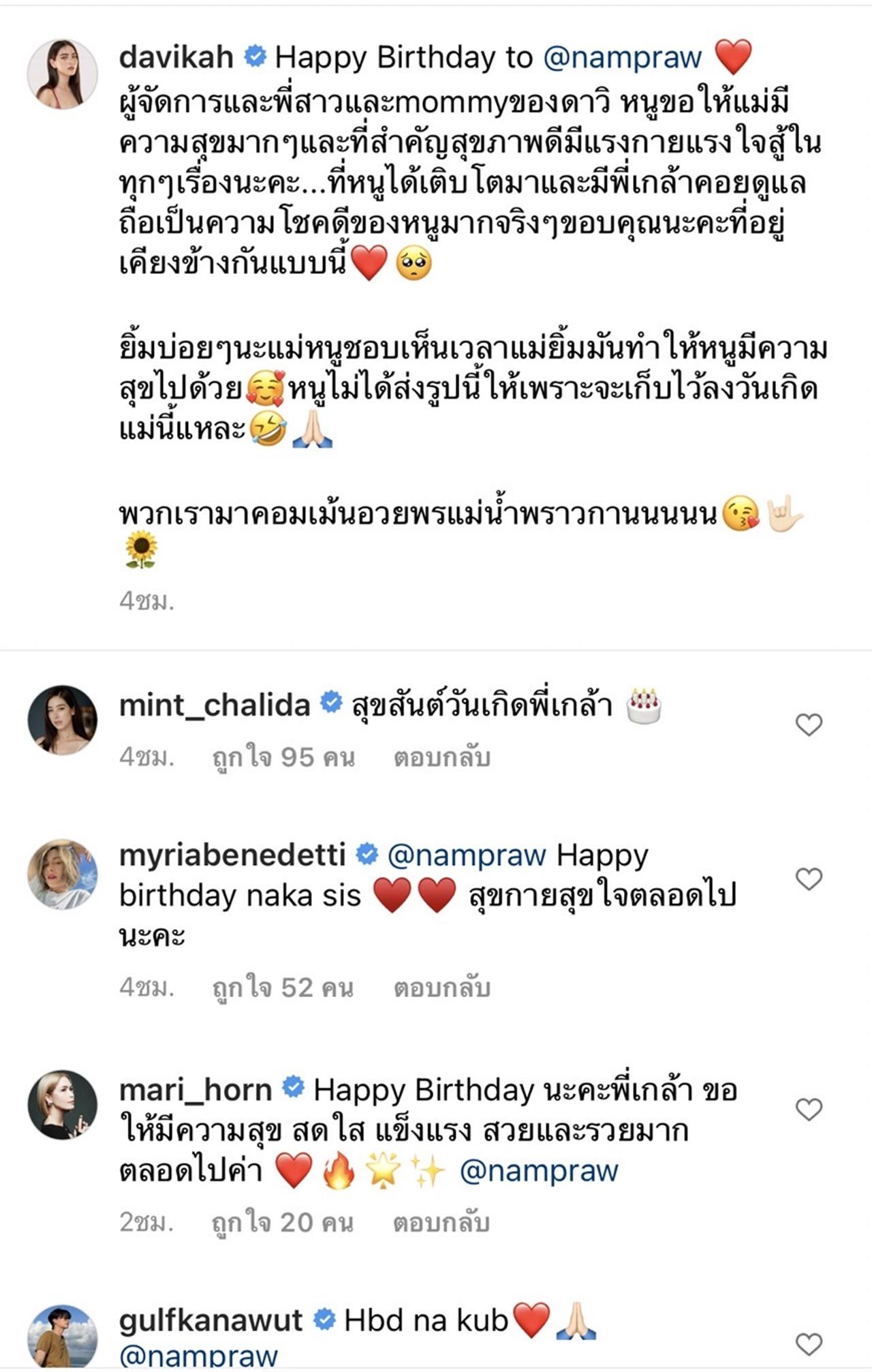 "Happy Birthday to @nampraw ผู้จัดการและพี่สาวและmommyของดาวิ หนูขอให้แม่มีความสุขมากๆและที่สำคัญสุขภาพดีมีแรงกายแรงใจสู้ในทุกๆเรื่องนะคะ...ที่หนูได้เติบโตมาและมีพี่เกล้าคอยดูแลถือเป็นความโชคดีของหนูมากจริงๆขอบคุณนะคะที่อยู่เคียงข้างกันแบบนี้
