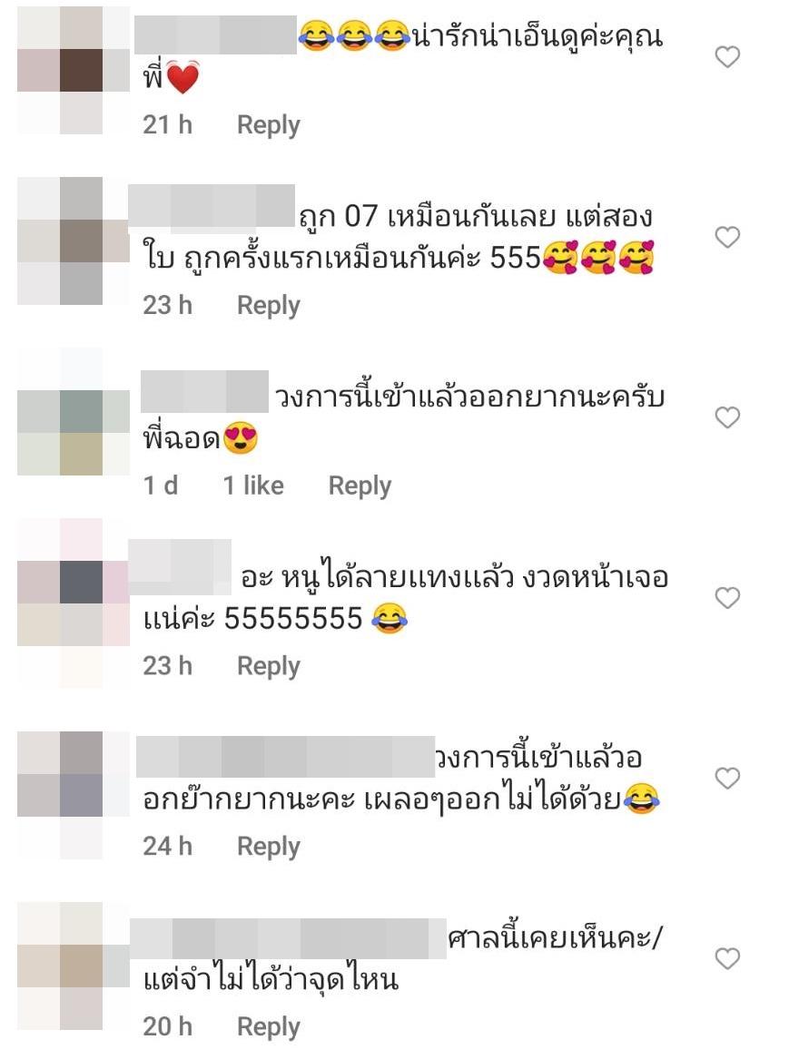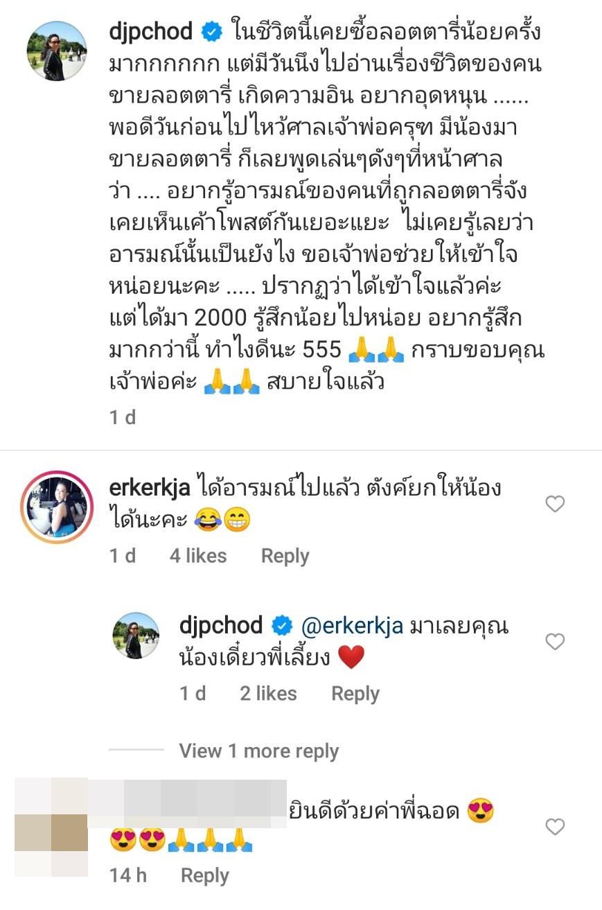 ท่ามกลางคอมเมนต์จากแฟนๆ ที่เข้ามาแสดงความคิดเห็น อาทิ ยินดีด้วยค่าพี่ฉอด, ถูก 07 เหมือนกันเลย แต่สองใบ ถูกครั้งแรกเหมือนกันค่ะ 55, วงการนี้เข้าแล้วออกยากนะครับพี่ฉอด, อะ หนูได้ลายเเทงเเล้ว งวดหน้าเจอเเน่ค่ะ 55555555, เอ่อ พี่ฉอดคะ ถ้าพี่ฉอดจะโพสต์แบบนี้...ต่อไปนี้ศาลเจ้าพ่อครุฑคงจะหัวกระไดไม่แห้งละมั้งคะ คนคงจะไม่ไหวจะเนืองแน่นแน่ๆ เลยเจ้าค่ะ!!! ฯลฯ