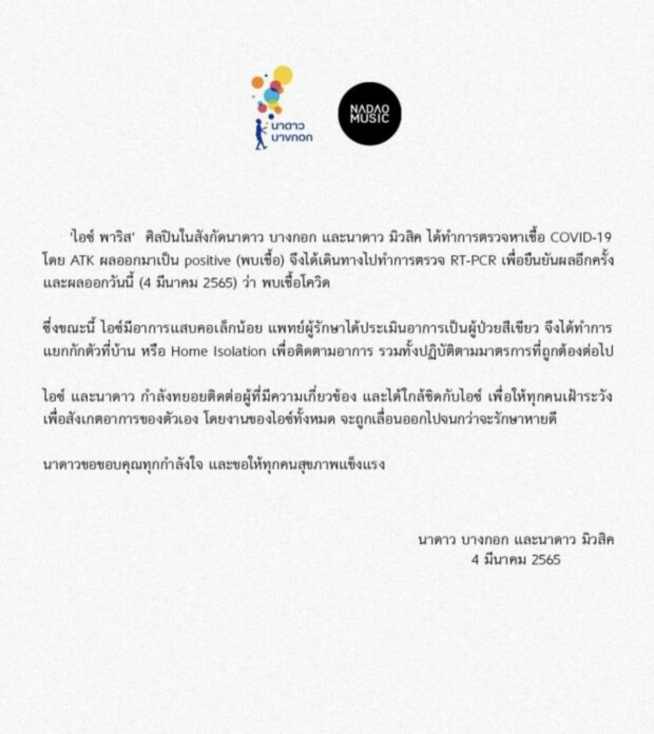 "ไอซ์ พาริส ศิลปินในสังกัดนาดาว บางกอก และนาดาว มิวสิค ได้ทำการตรวจหาเชื้อ COVID-19 โดย ATK ผลออกมาเป็น positive (พบเชื้อ) จึงได้เดินทางไปทำการตรวจ RT-PCR เพื่อยืนยันผลอีกครั้ง และผลออกวันนี้ (4 มีนาคม 2565) ว่าพบเชื้อโควิด