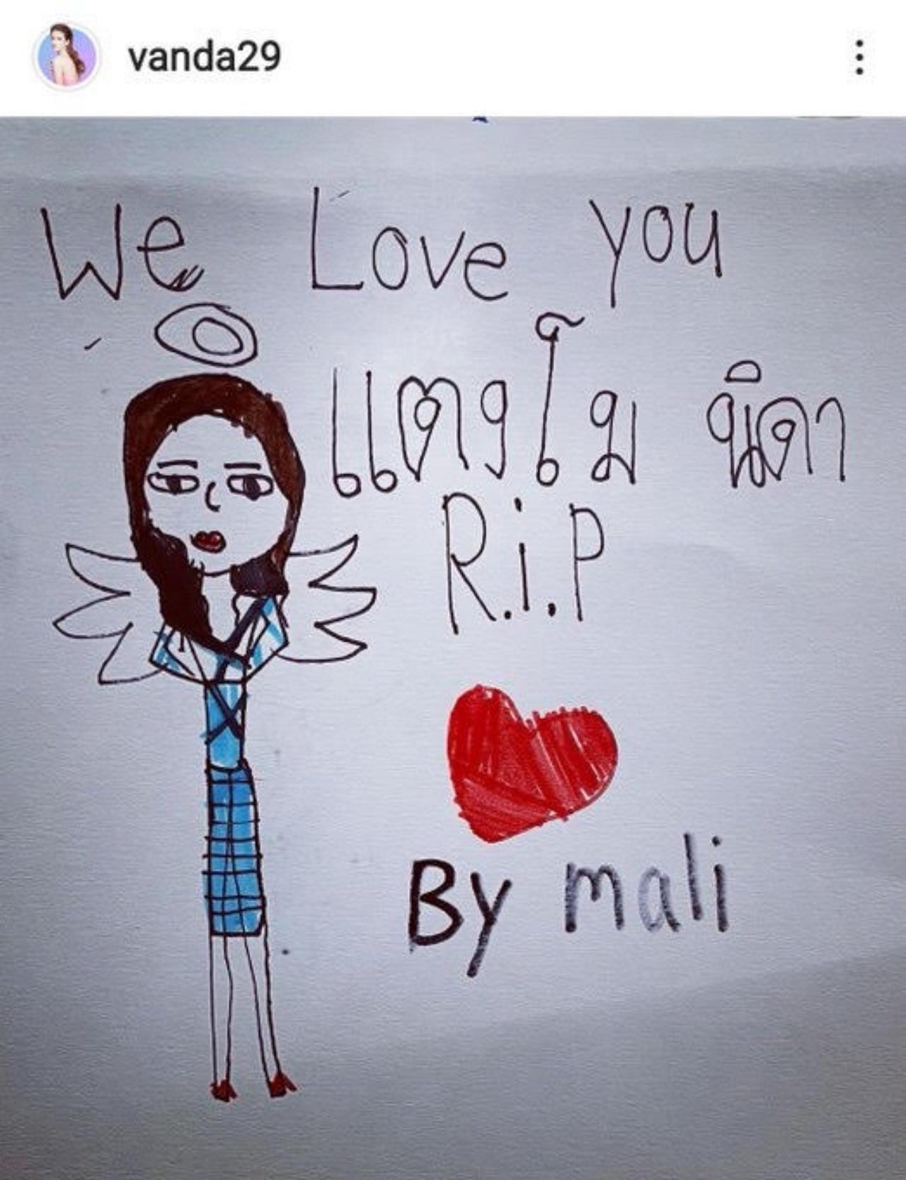 ชาวไทยและดาราดัง ยังตามติดต่อตลอด กับคดีแตงโม ล่าสุด น้องมะลิ พาขวัญ สหวงษ์ ลูกสาววัยน่ารักของ โบว์ แวนดา, อดีตพระเอกดัง ปอ ทฤษฎี สหวงษ์ ได้วาดรูปน่ารักมากๆ พร้อมติดปีกให้แตงโม น่าจะสื่อถึงนางฟ้า พร้อมข้อความที่ว่า We Love You แตงโม นิดา RIP By mali โดยมีแคปชั่นที่แม่โบว์ พิมพ์ไว้คือ มะลิวาดให้พี่แตงโมนะคะ.