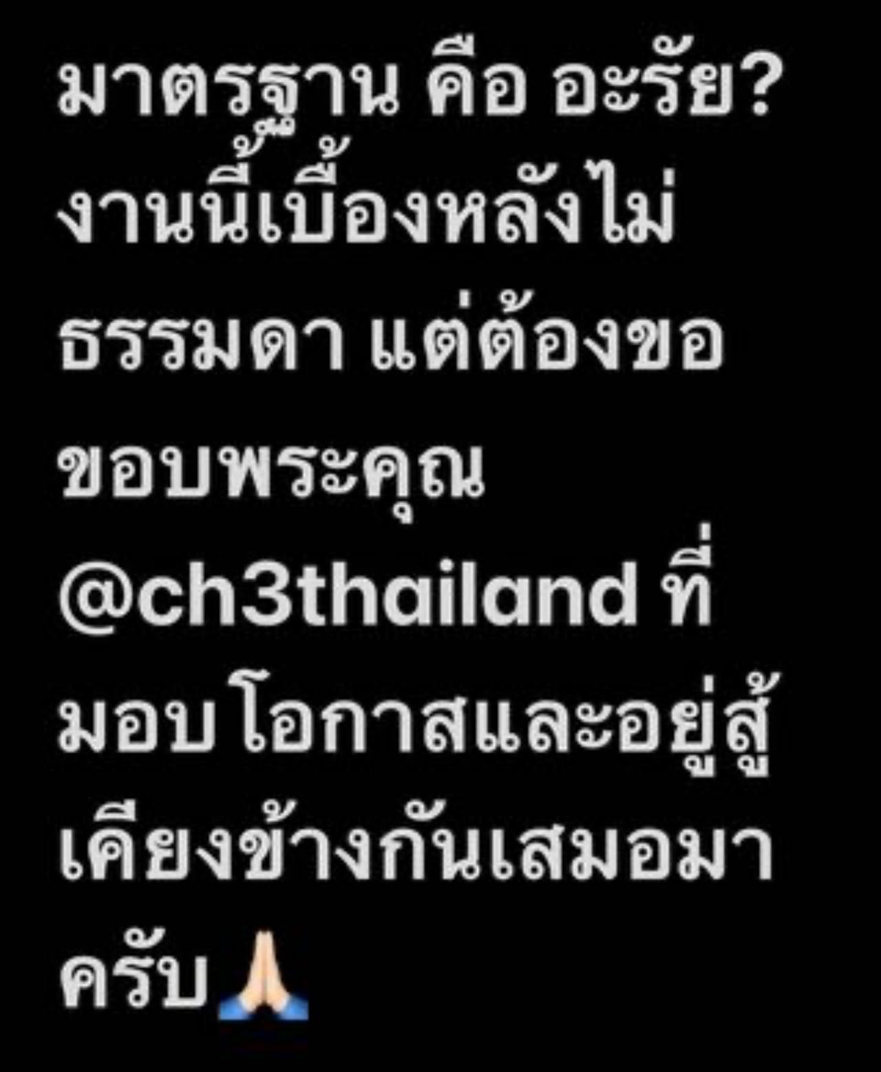 และยังโพสต์อีกว่า “มาตรฐานคืออะไร งานนี้เบื้องหลังไม่ธรรมดา แต่ต้องขอขอบพระคุณ @ch3thailand ที่มอบโอกาสและอยู่สู้เคียงข้างกันเสมอมาครับ”