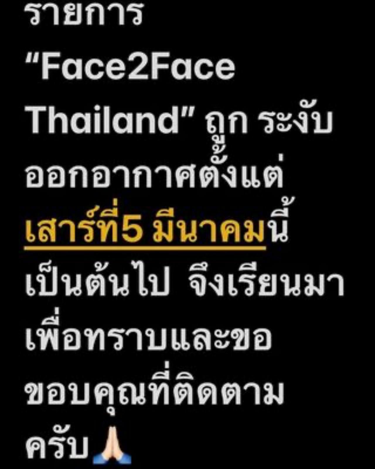 จน "เต้ ปิยะรัฐ กัลย์จาฤก" ผู้บริหารค่ายกันตนาและเป็นผู้จัดรายการ ได้ออกมาเปิดเผยว่า “รายการ Face2FaceThailand ถูกระงับออกอากาศตั้งแต่เสาร์ที่ 5 มีนาคมนี้ เป็นต้นไป จึงเรียนมาเพื่อทราบและขอขอบคุณที่ติดตาม”