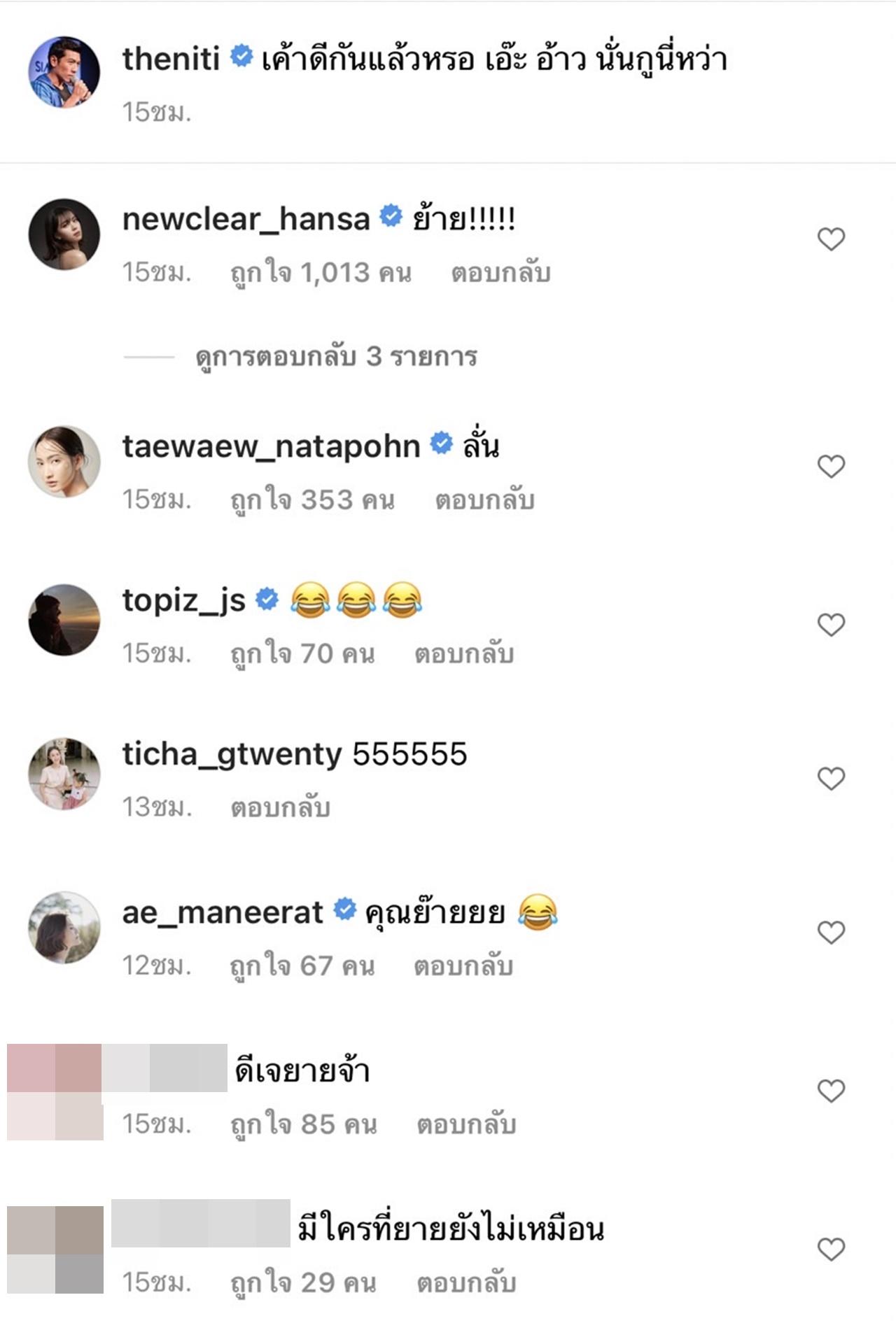 งานนี้ทำเอาแฟนๆ ที่ติดตามต่างเข้ามาขำกันเป็นแถวในความเหมือนนี้ และยังมาแซวอีกว่า ยายที่หน้าเหมือนดาราชายทุกคนยกเว้นตัวเอง.