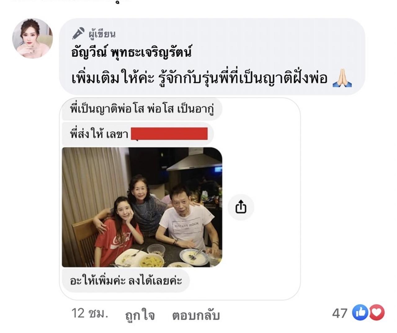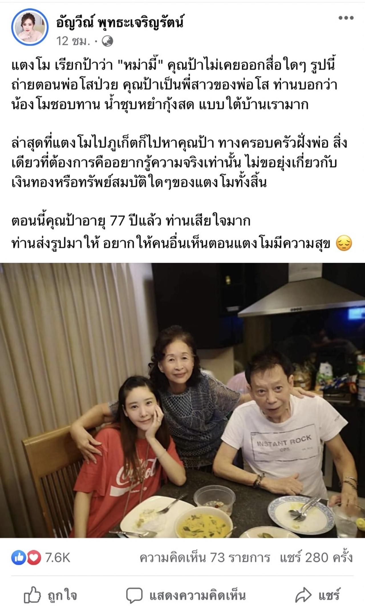 ล่าสุดที่แตงโมไปภูเก็ตก็ไปหาคุณป้า ทางครอบครัวฝั่งพ่อ สิ่งเดียวที่ต้องการคืออยากรู้ความจริงเท่านั้น ไม่ขอยุ่งเกี่ยวกับเงินทองหรือทรัพย์สมบัติใดๆ ของแตงโมทั้งสิ้น ตอนนี้คุณป้าอายุ 77 ปีแล้ว ท่านเสียใจมาก ท่านส่งรูปมาให้ อยากให้คนอื่นเห็นตอนแตงโมมีความสุข".
