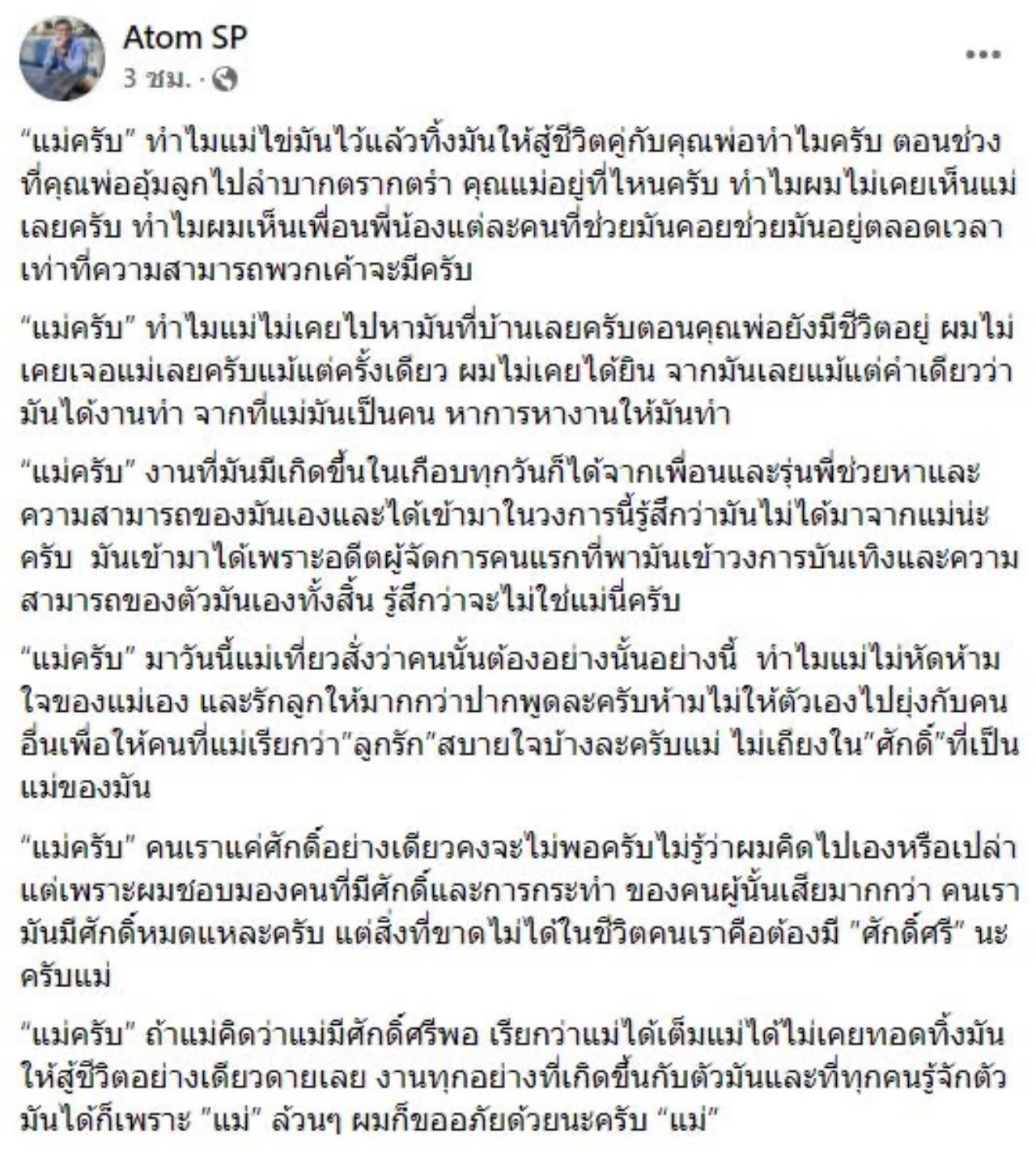 “แม่ครับ” ถ้าแม่คิดว่าแม่มีศักดิ์ศรีพอ เรียกว่าแม่ได้เต็มแม่ได้ ไม่เคยทอดทิ้งมัน ให้สู้ชีวิตอย่างเดียวดายเลย งานทุกอย่างที่เกิดขึ้นกับตัวมัน และที่ทุกคนรู้จักตัวมันได้ก็เพราะ "แม่" ล้วนๆ ผมก็ขออภัยด้วยนะครับ “แม่”.