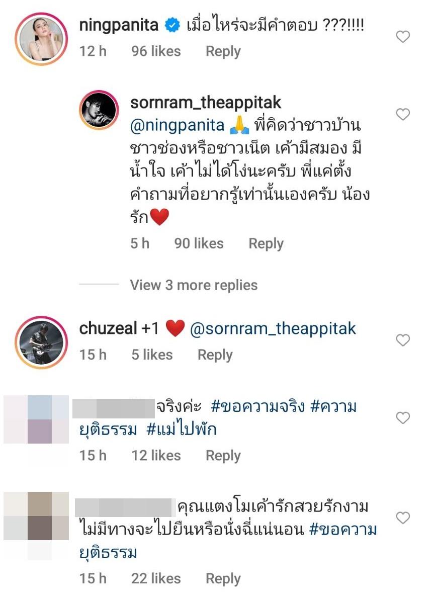 โดยมีแฟนๆ เข้ามาแสดงความคิดเห็นถึงเรื่องนี้มากมาย ด้าน หนิง ปณิตา ก็ได้เข้ามาคอมเมนต์ว่า “เมื่อไหร่จะมีคำตอบ ???!!!!” ก่อนที่หนุ่มจะตอบกลับว่า “พี่คิดว่าชาวบ้านชาวช่องหรือชาวเน็ต เค้ามีสมอง มีน้ำใจ เค้าไม่ได้โง่นะครับ พี่แค่ตั้งคำถามที่อยากรู้เท่านั้นเองครับ น้องรัก”.