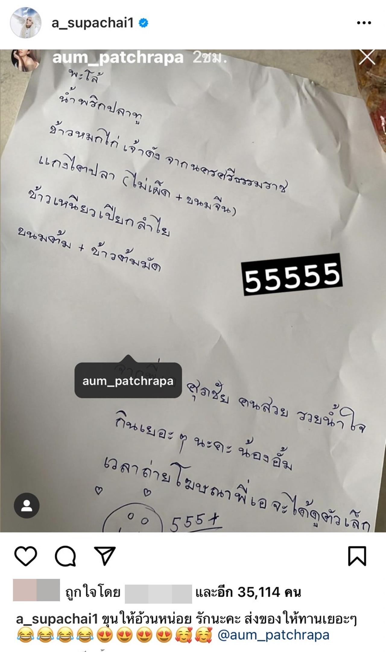 ด้าน เอ ศุภชัย ก็ได้โพสต์ภาพดังกล่าวพร้อมเขียนแคปชั่นว่า "ขุนให้อ้วนหน่อย รักนะคะ ส่งของให้ทานเยอะๆ @aum_patchrapa".