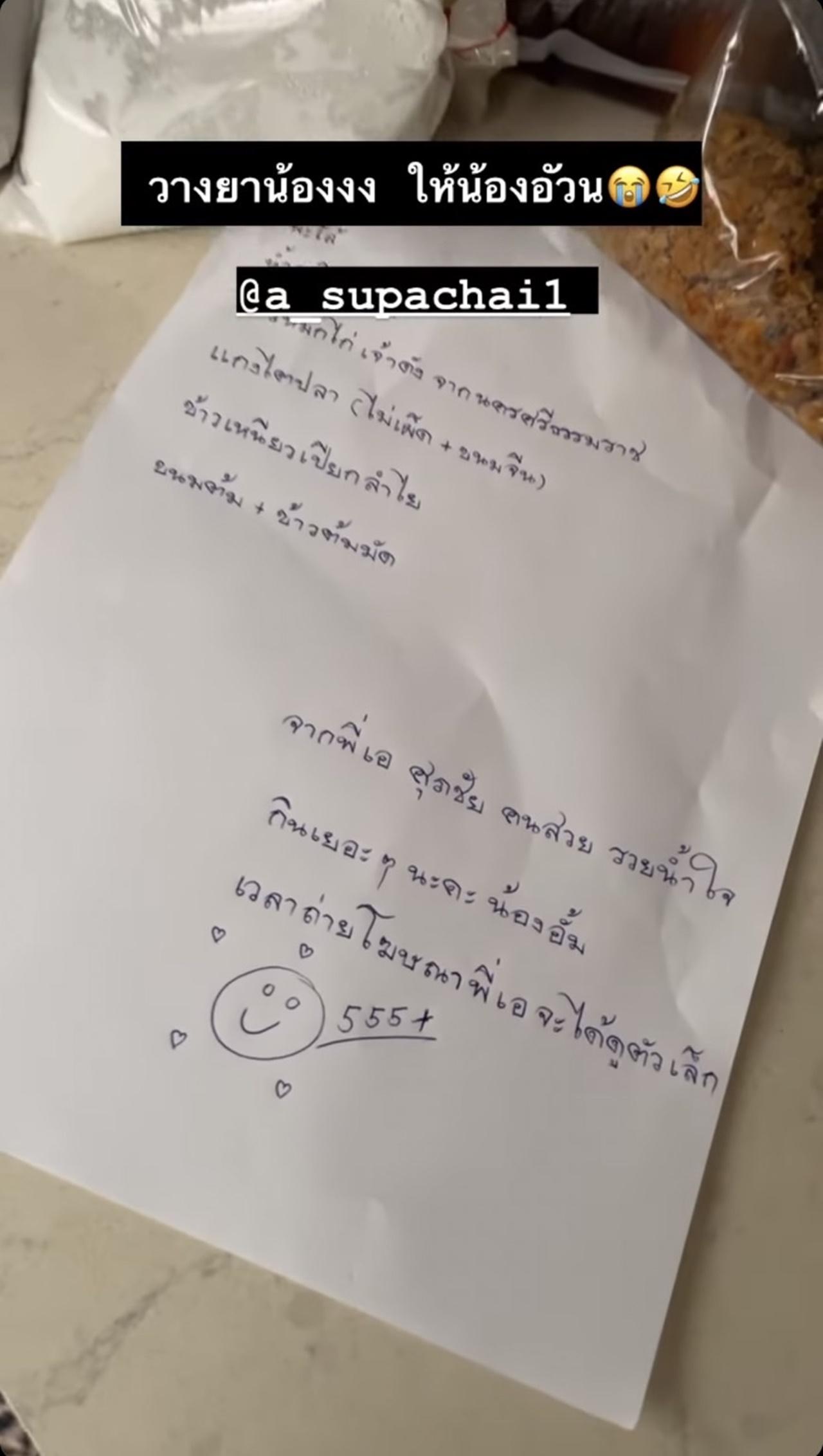 โดย อั้ม ได้เผยภาพจดหมายน้อยที่ พี่เอ เขียนใส่กระดาษแนบมาให้ โดยบอกว่า "พะโล้ น้ำพริกปลาทู ข้าวหมกไก่เจ้าดัง จากนครศรีธรรมราช แกงไตปลา (ไม่เผ็ด + ขนมจีน) ข้าวเหนียวเปียกลำไย ขนมต้ม + ข้าวต้มมัด จากพี่เอ ศุภชัย คนสวย รวยน้ำใจ กินเยอะๆ นะคะ น้องอั้ม เวลาถ่ายโฆษณา พี่เอจะได้ดูตัวเล็ก" พร้อมกับเขียนข้อความว่า "วางยาน้อง ให้น้องอ้วน"