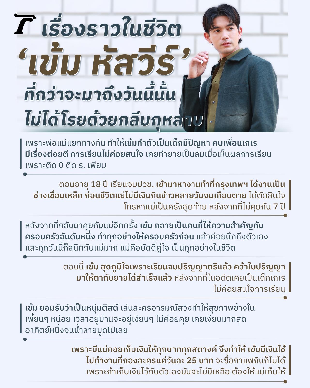 ส่วนเรื่องสาเหตุของความเป็นเด็กเกเรของ เข้ม หัสวีร์ นั้น เจ้าตัวเล่าให้เราฟังว่าเพราะอะไรถึงทำให้เข้มเลือกที่จะหันหลังให้ครอบครัวตั้งแต่อายุยังน้อย และเลือกออกมาสู้ชีวิตด้วยตัวเอง