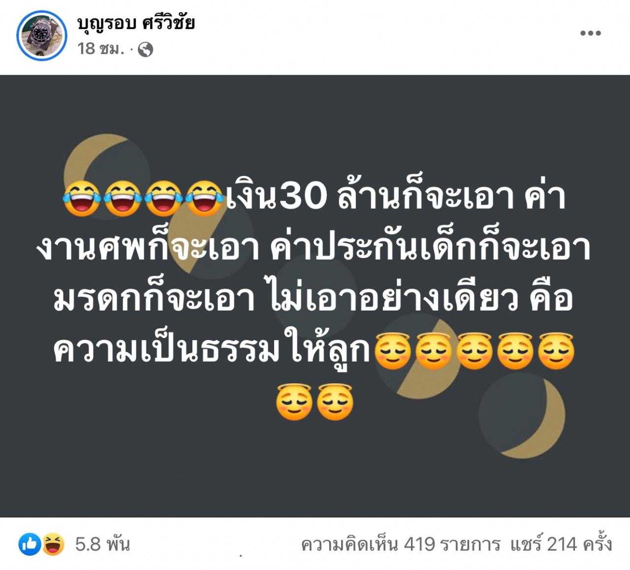 เอกชัย ได้โพสต์ที่เฟซบุ๊ก บุญรอบ ศรีวิชัย ดังนี้ "เงิน 30 ล้านก็จะเอา ค่างานศพก็จะเอา ค่าประกันเด็กก็จะเอา มรดกก็จะเอา ไม่เอาอย่างเดียว คือความเป็นธรรมให้ลูก" หลังจากโพสต์ไปแล้ว มีคนแห่กดไลค์แชร์ไปเยอะมากๆ.