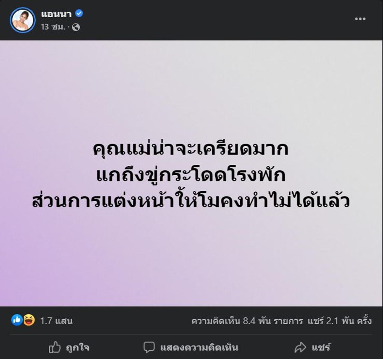 ล่าสุด แอนนา ทีวีพูล ได้โพสต์ข้อความผ่านเพจของตัวเองว่า "คุณแม่น่าจะเครียดมาก แกถึงขู่กระโดดโรงพัก ส่วนการแต่งหน้าให้โมคงทำไม่ได้แล้ว"