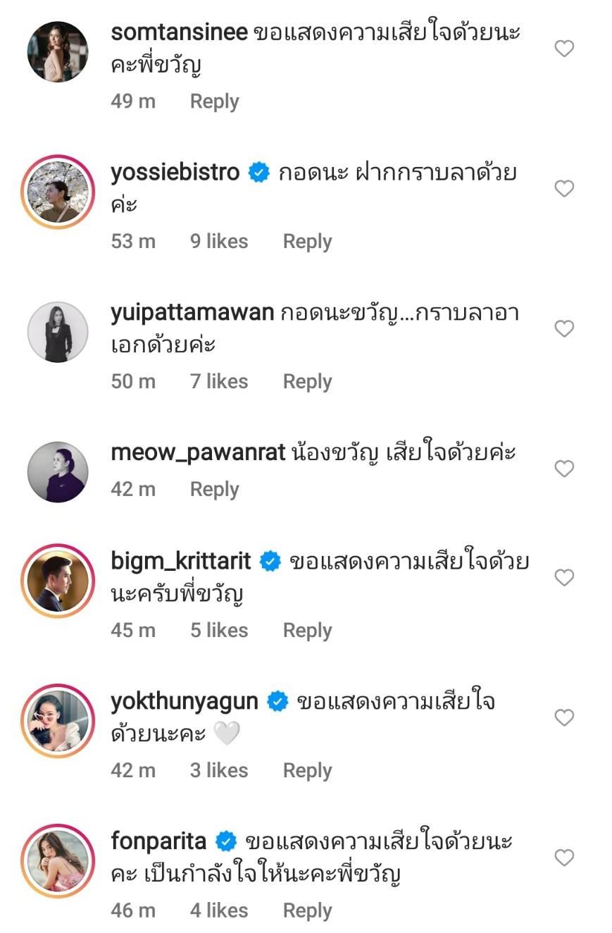 โดยมีคนในวงการบันเทิงคอมเมนต์แสดงความอาลัยและให้กำลังใจ อาทิ เชียร์ ฑิฆัมพร “เป็นกำลังให้นะคะพี่”, เอ ศุภชัย “พี่ขอแสดงความเสียใจด้วยนะคะน้อง กอดๆๆ นะคะ”, ส้ม ธัญสินี “ขอแสดงความเสียใจด้วยนะคะพี่ขวัญ”, จ๋า ยศสินี “กอดนะ ฝากกราบลาด้วยค่ะ”, บิ๊กเอ็ม กฤตฤทธิ์ “ขอแสดงความเสียใจด้วยนะครับพี่ขวัญ”, หยก ธัญยกันต์ “ขอแสดงความเสียใจด้วยนะคะ”, กวาง กมลชนก “ขอแสดงความเสียใจด้วยนะคะน้องขวัญ” ฯลฯ บันเทิงไทยรัฐออนไลน์ขอแสดงความเสียใจด้วยนะคะ.