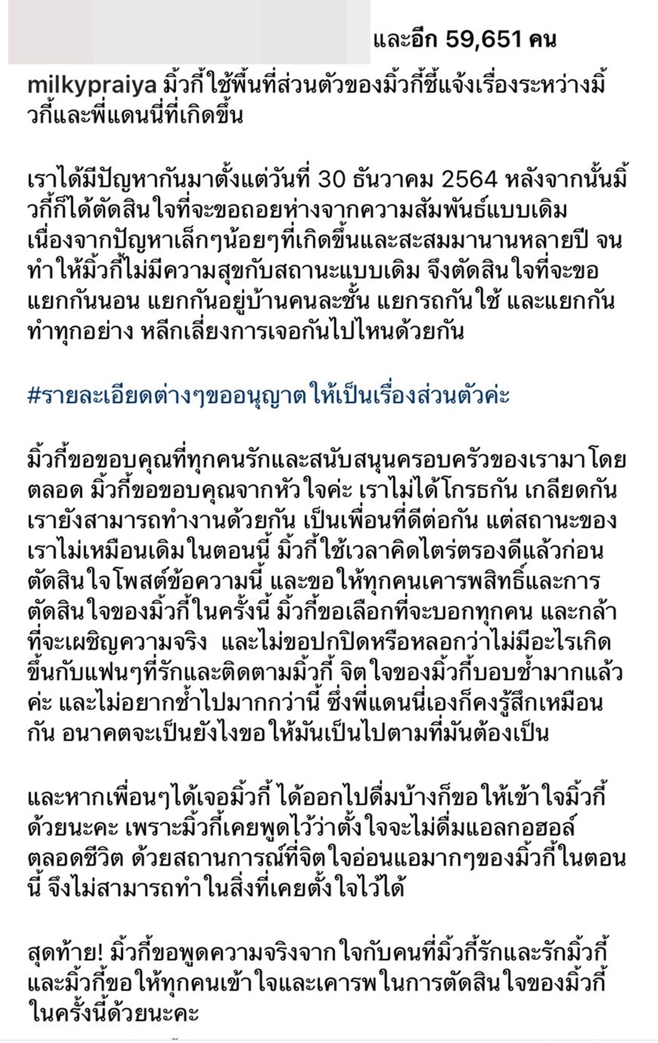 แต่สถานะของเราไม่เหมือนเดิมในตอนนี้ มิ้วกี้ใช้เวลาคิดไตร่ตรองดีแล้วก่อนตัดสินใจโพสต์ข้อความนี้ และขอให้ทุกคนเคารพสิทธิ์และการตัดสินใจของมิ้วกี้ในครั้งนี้