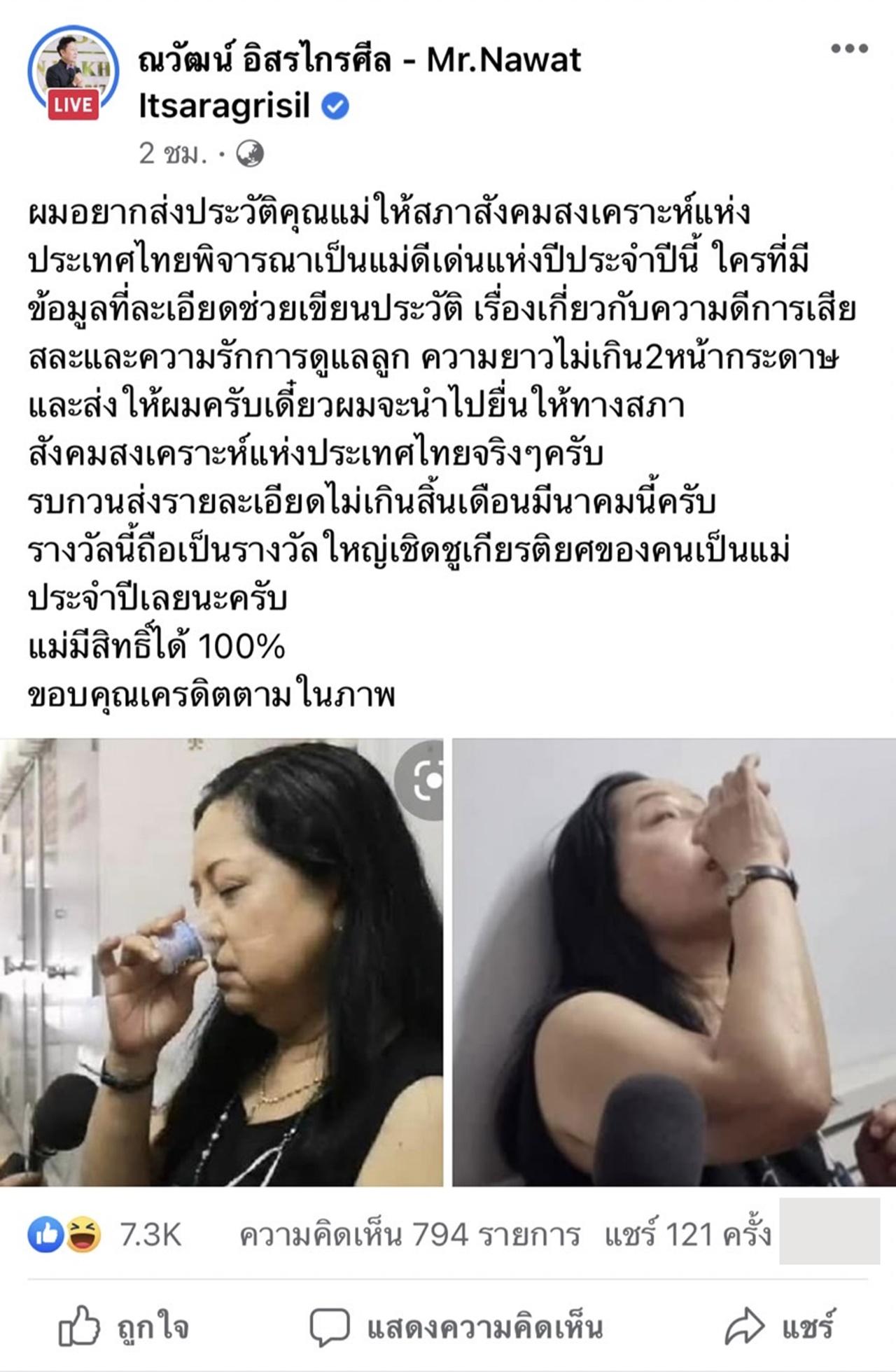"ผมอยากส่งประวัติคุณแม่ให้สภาสังคมสงเคราะห์แห่งประเทศไทย พิจารณาเป็นแม่ดีเด่นแห่งปีประจำปีนี้ ใครที่มีข้อมูลที่ละเอียดช่วยเขียนประวัติ