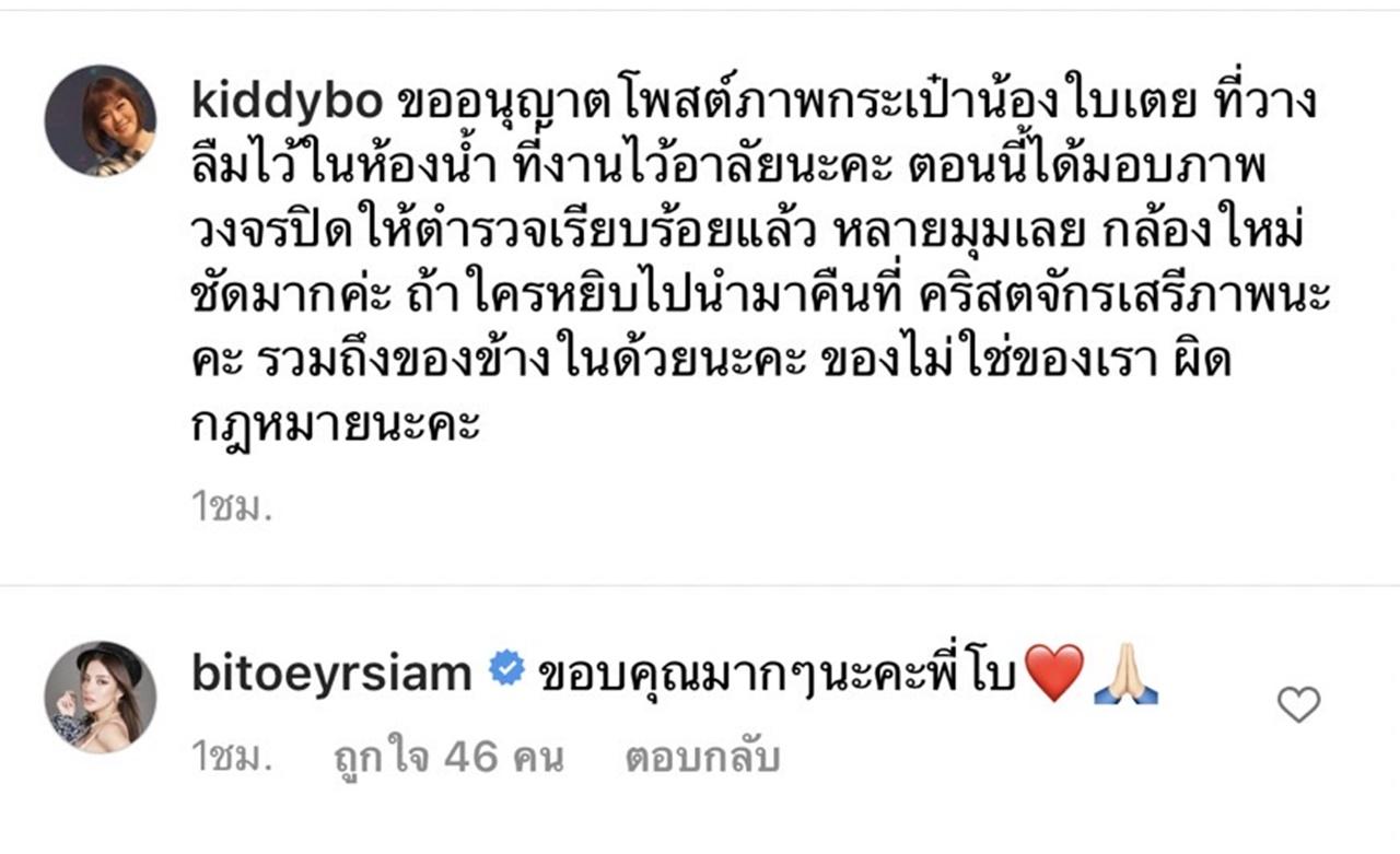 ด้าน ใบเตย ก็ได้เข้ามาคอมเมนต์ขอบคุณ โบ ที่ช่วยประกาศตามหากระเป๋าให้ "ขอบคุณมากๆนะคะพี่โบ".