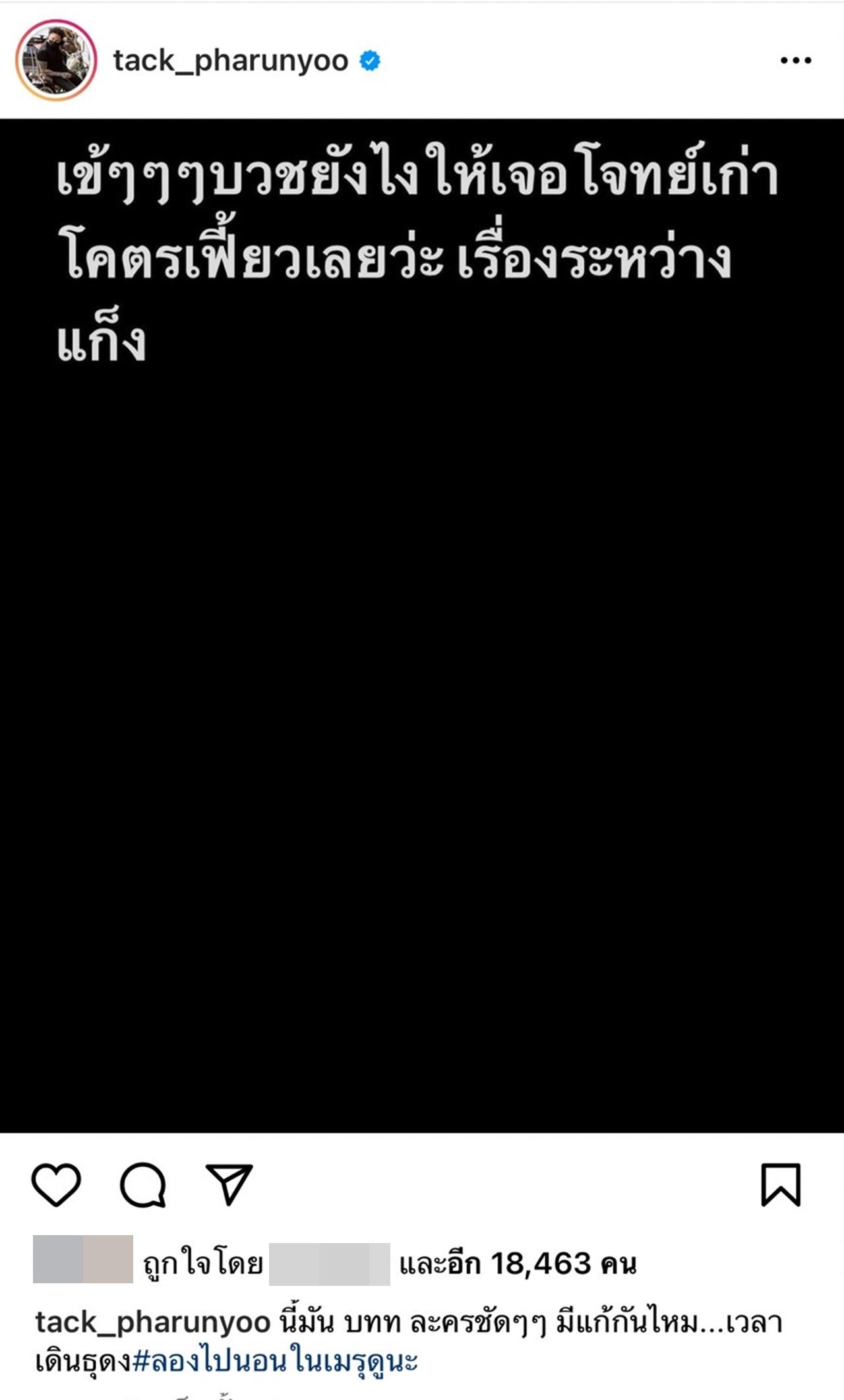 งานนี้ทำเอา แทค ภรัณยู ถึงกับโพสต์ข้อความผ่านอินสตาแกรมว่า "เข้ๆๆๆบวชยังไงให้เจอโจทย์เก่า โคตรเฟี้ยวเลยว่ะ เรื่องระหว่างแก็ง" และเขียนแคปชั่นว่า "นี้มัน บทท ละครชัดๆๆ มีแก้กันไหม...เวลาเดินธุดง#ลองไปนอนในเมรุดูนะ".