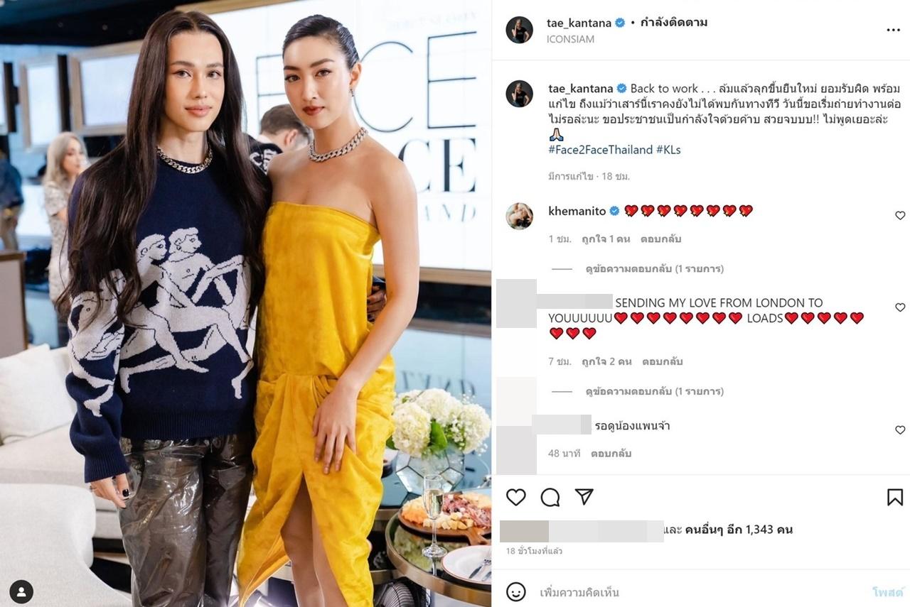 “Back to work . . . ล้มแล้วลุกขึ้นยืนใหม่ ยอมรับผิด พร้อมแก้ไข ถึงแม้ว่าเสาร์นี้เราคงยังไม่ได้พบกันทางทีวี วันนี้ขอเริ่มถ่ายทำงานต่อ ไม่รอล่ะนะ ขอประชาชนเป็นกำลังใจด้วยค้าบ สวยจบบบ!! ไม่พูดเยอะล่ะ”