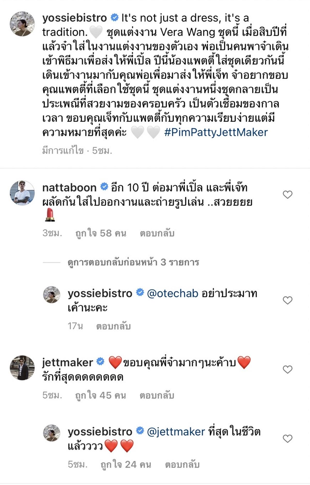 จ๋าอยากขอบคุณแพตตี้ที่เลือกใช้ชุดนี้ ชุดแต่งงานหนึ่งชุดกลายเป็นประเพณีที่สวยงามของครอบครัว เป็นตัวเชื่อมของกาลเวลา ขอบคุณเจ็ทกับแพตตี้กับทุกความเรียบง่ายแต่มีความหมายที่สุดค่ะ #PimPattyJettMaker".