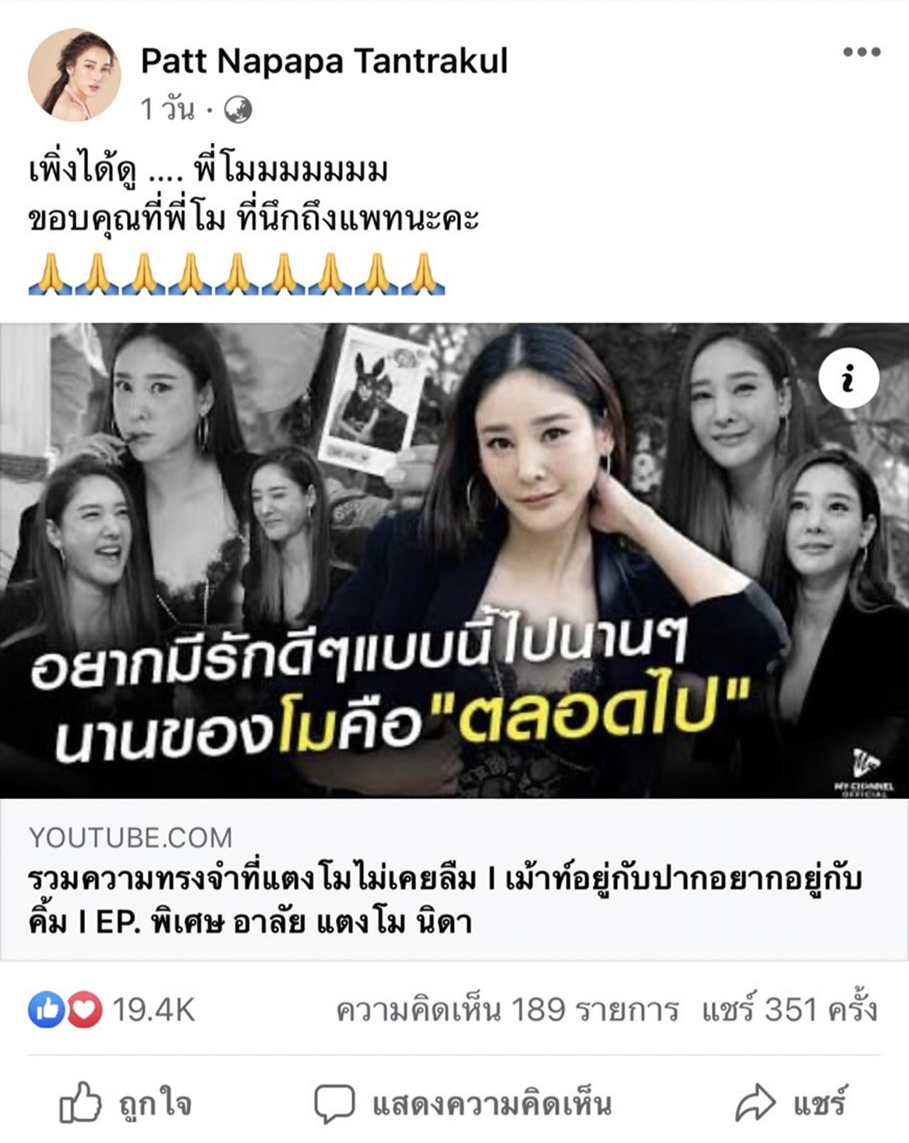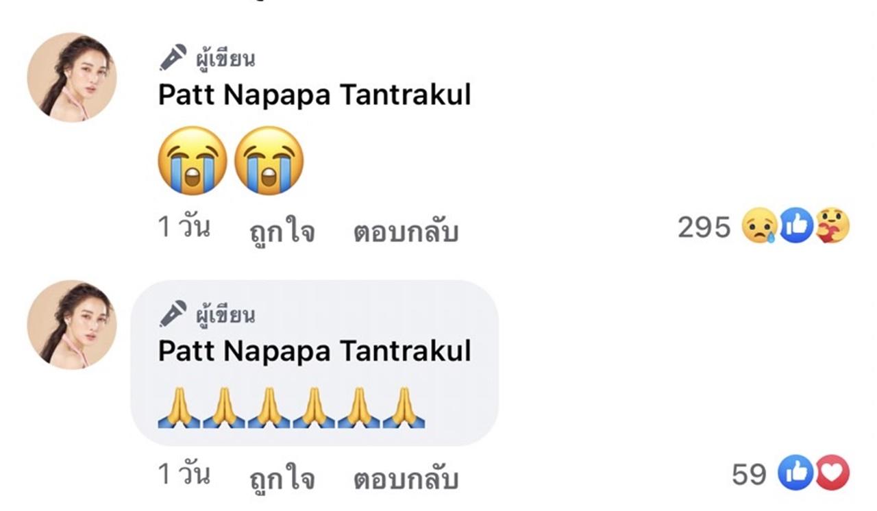 งานนี้หลังจากที่ แพท ณปภา ได้ดูคลิปดังกล่าว ก็ได้แชร์คลิปนั้นพร้อมแคปชั่นว่า "เพิ่งได้ดู …. พี่โมมมมมมม ขอบคุณที่พี่โม ที่นึกถึงแพทนะคะ" พร้อมกับอีโมติคอนรูปร้องไห้น้ำตาไหล และงานนี้ก็มีแฟนๆ เข้ามาคอมเมนต์อาลัยนักแสดงสาว แตงโม นิดา เป็นจำนวนมาก.