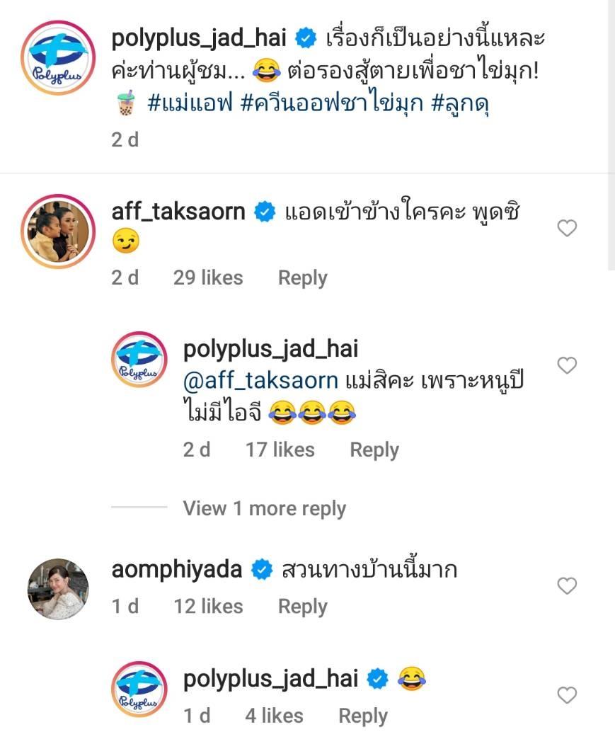 ซึ่งหลังจากที่แอดมินไอจีค่ายโพลีพลัสโพสต์คลิปไปก็มีแฟนๆ เข้ามาแสดงความคิดเห็น ด้านคุณแม่แอฟก็โพสต์ถามตรงๆ กับแอดมินว่า “แอดเข้าข้างใครคะ พูดซิ” และแอดมินตอบว่า “แม่สิคะ เพราะหนูปีไม่มีไอจี”.