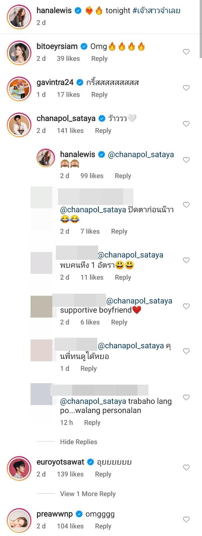 ซึ่งนอกจากจะมีเพื่อนๆ ในวงการบันเทิงต่างคอมเมนต์แซวความแซ่บของภาพแบบรัวๆ แล้ว งานนี้หวานใจของฮาน่าอย่างพระเอกหนุ่ม อ๊อฟ ชนะพล สัตยา ก็เข้ามาคอมเมนต์แซวว่า “ว้าววว” และใส่อีโมจิหัวใจสีขาว ก่อนที่ฮาน่าจะตอบกลับเป็นอีโมจิลิงปิดตา ทำเอาแฟนๆ แห่แซวอ๊อฟแบบเต็มๆ อาทิ ปิดตาก่อนน๊าา, พบคนหึง 1 อัตรา, คุนพี่ทนดูได้หยอ ฯลฯ.