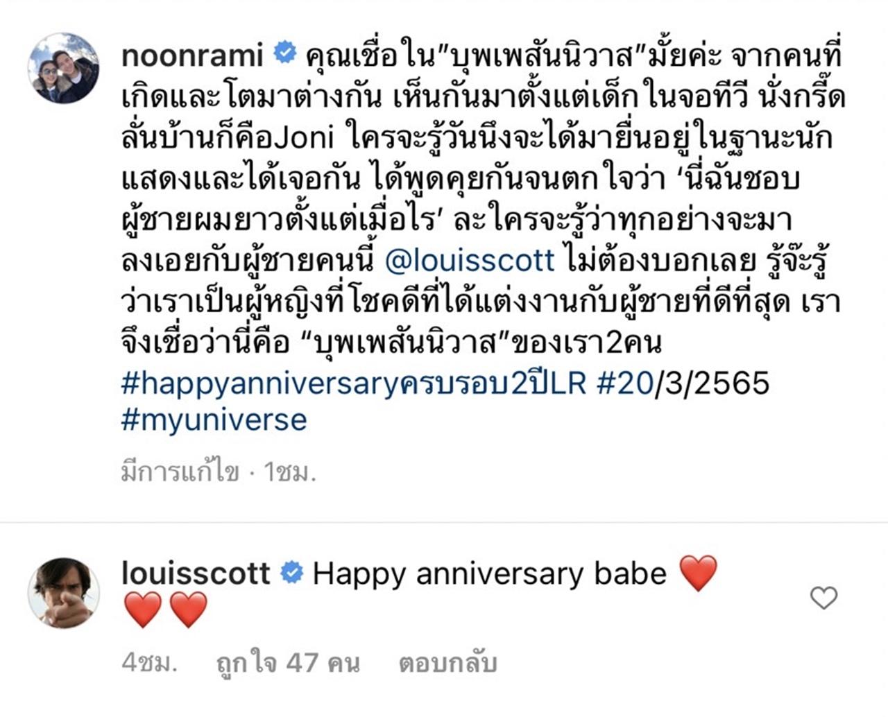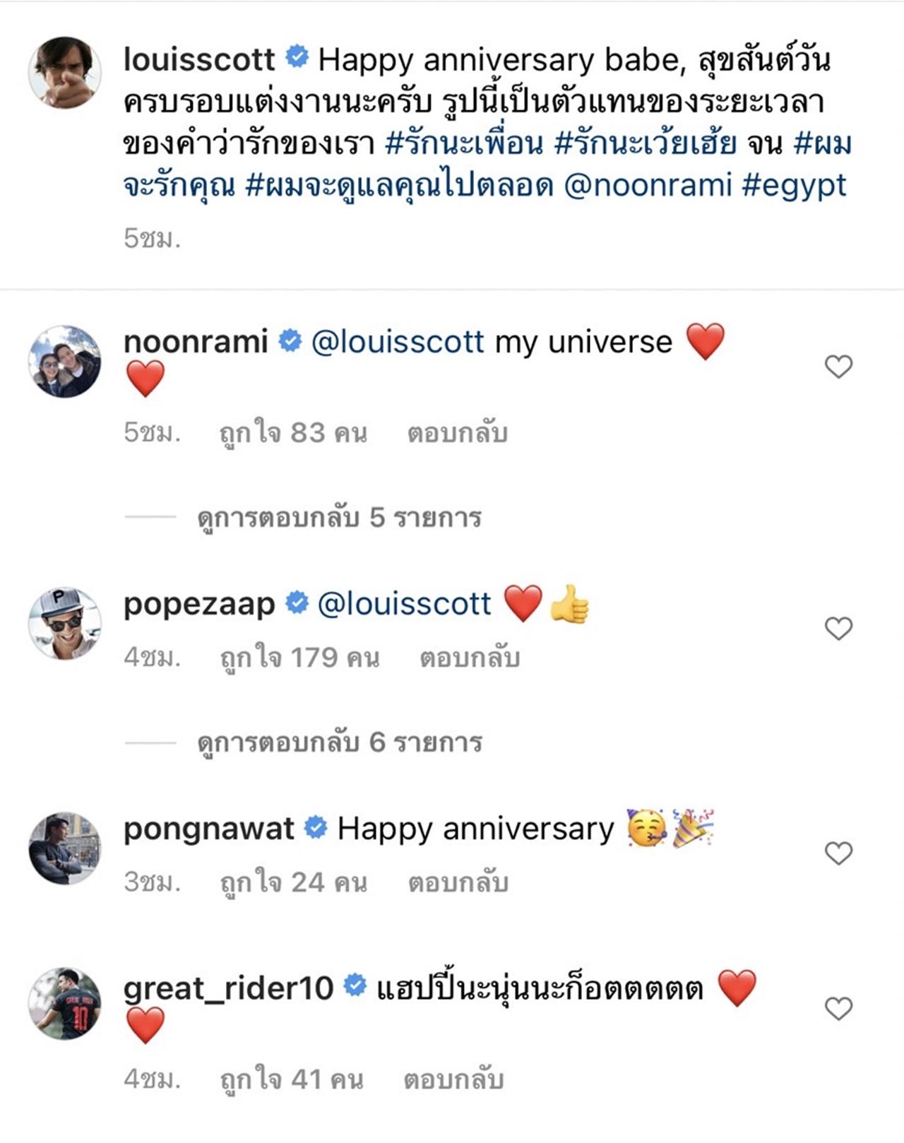 ด้านหนุ่ม หลุยส์ สก็อต ก็ได้โพสต์ภาพและเขียนข้อความถึง นุ่น ว่า "Happy anniversary babe, สุขสันต์วันครบรอบแต่งงานนะครับ รูปนี้เป็นตัวแทนของระยะเวลาของคำว่ารักของเรา #รักนะเพื่อน #รักนะเว้ยเฮ้ย จน #ผมจะรักคุณ #ผมจะดูแลคุณไปตลอด @noonrami #egypt".