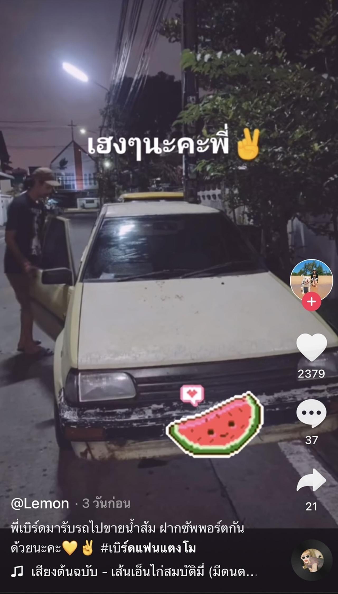 ล่าสุดผู้ใช้ติ๊กต๊อกที่มีชื่อว่า @Lemon ได้โพสต์คลิปเป็นภาพที่ เบิร์ด กำลังเปิดประตูรถเก๋งสีขาว พร้อมกับเขียนแคปชั่นว่า "พี่เบิร์ดมารับรถไปขายน้ำส้ม ฝากซัพพอร์ตกันด้วยนะคะ"
