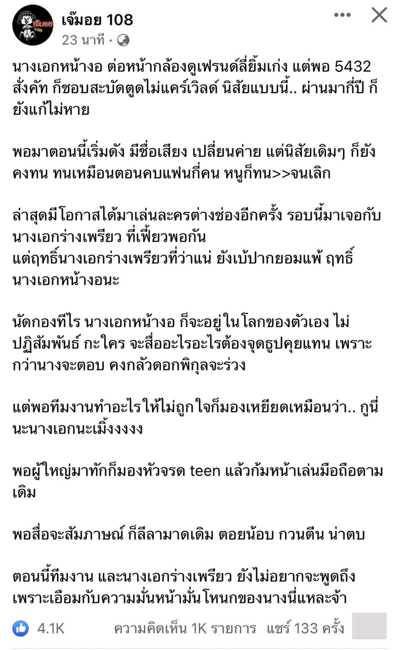 ทำเอาชาวเน็ตเรียกหัวหน้าห้องกันยกใหญ่ เมื่อเพจดัง เจ๊มอย 108 ได้เขียนอักษรย่อเม้าท์ๆ ถึงพฤติกรรมของนางเอกสาวรายหนึ่ง ที่ทำเอาคนที่ได้ร่วมงานถึงกับเบ้ปากใส่ว่า