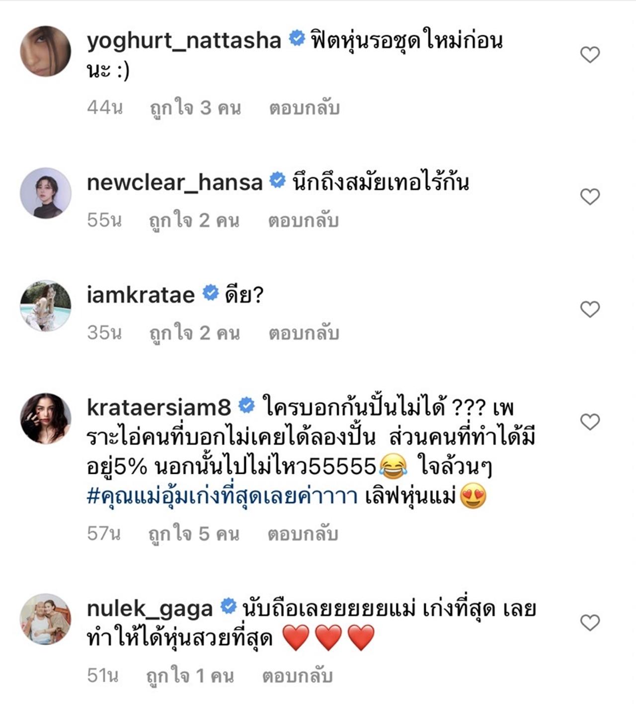 ด้าน กระแต อาร์สยาม ก็เป็นอีกหนึ่งคนที่ปั้นหุ่นจนสวยเด้งเช่นกัน ก็ได้เข้ามาคอมเมนต์ว่า "ใครบอกก้นปั้นไม่ได้ ??? เพราะไอ่คนที่บอกไม่เคยได้ลองปั้น ส่วนคนที่ทำได้มีอยู่5% นอกนั้นไปไม่ไหว55555 ใจล้วนๆ #คุณแม่อุ้มเก่งที่สุดเลยค่าาาา เลิฟหุ่นแม่".