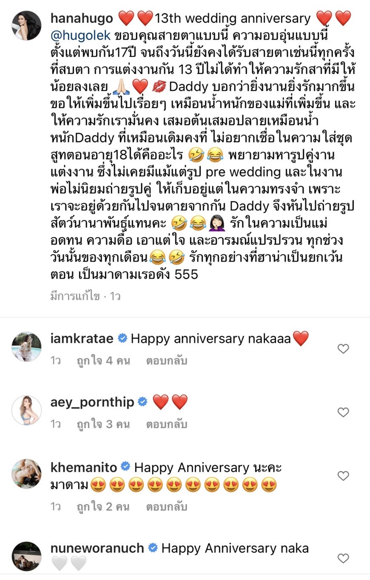 ล่าสุดในวันครบรอบแต่งงาน 13 ปี ฮาน่า ก็ได้เขียนเล่าเรื่องราวตั้งแต่วันแรกที่เจอกัน พร้อมบอกเผยเหตุผลที่ว่า ทำไมถึงไม่ค่อยมีรูปในงานแต่งงาน และรูปคู่กับ ฮิวโก้ ให้ได้เห็น