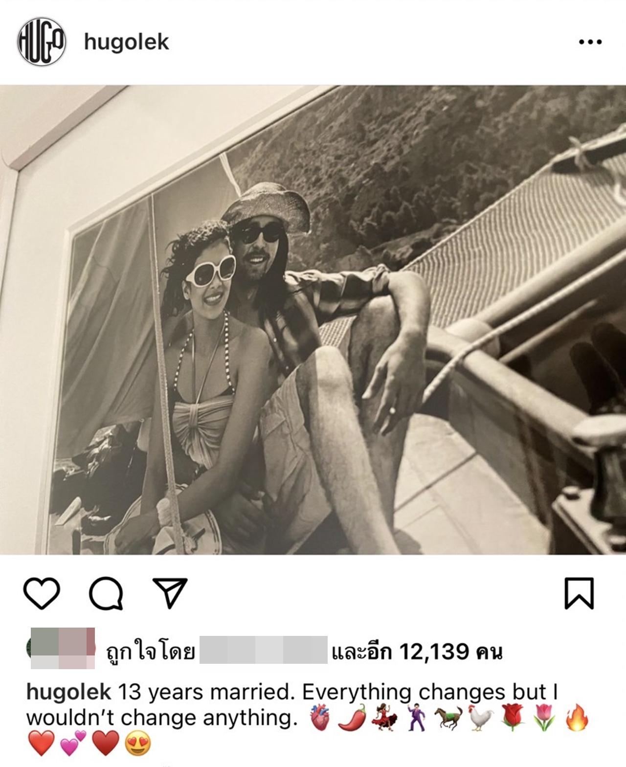 ด้าน ฮิวโก้ ก็ได้โพสต์ภาพคู่กับภรรยา พร้อมเขียนว่า "13 years married. Everything changes but I wouldn’t change anything.".