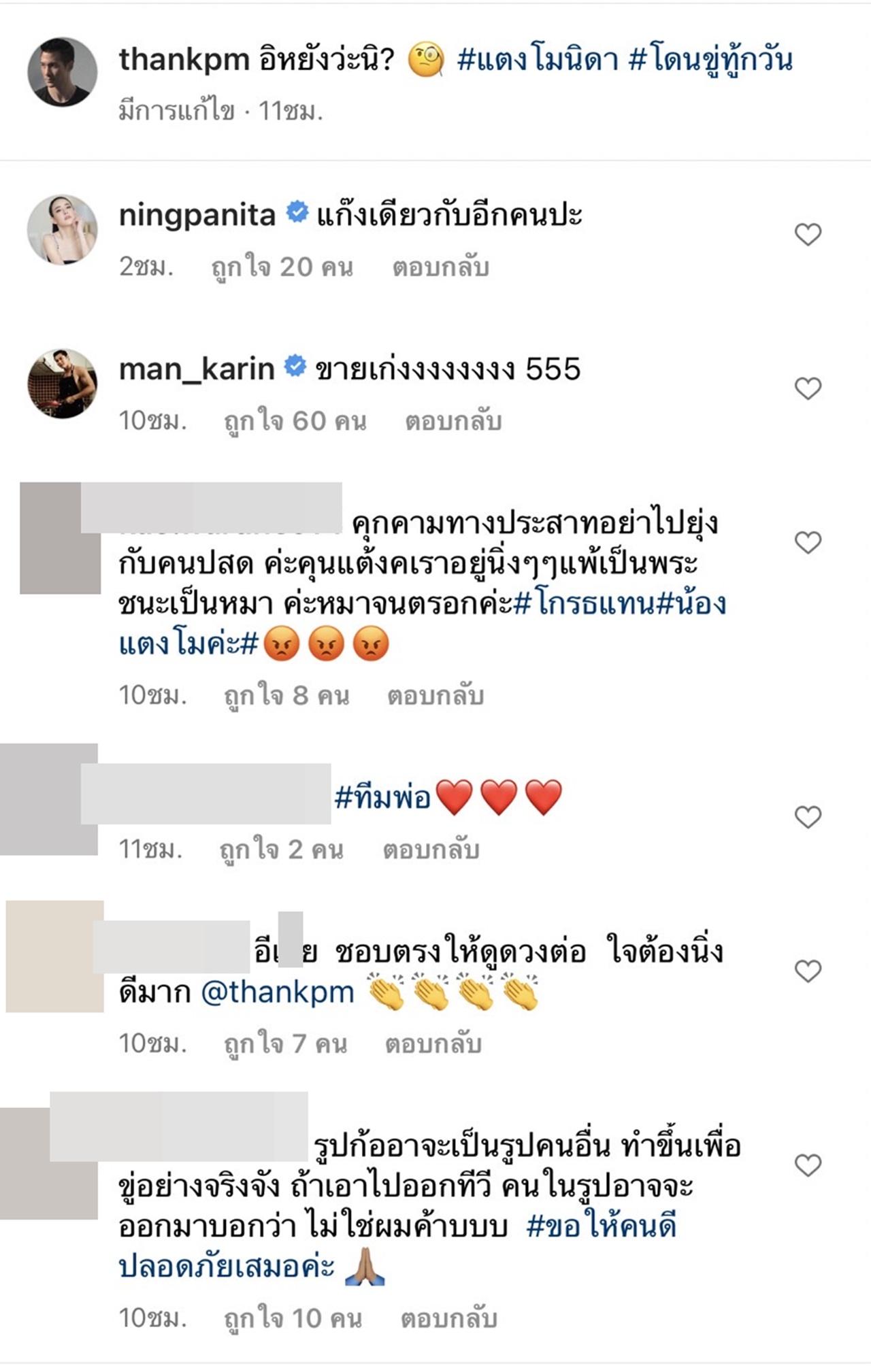 ก่อนที่จะแคปข้อความดังกล่าวมาโพสต์ลงในอินสตาแกรมของตัวเอง พร้อมกับเขียนแคปชั่นว่า "อิหยังว่ะนิ? #แตงโมนิดา #โดนขู่ทู้กวัน" หลังจากที่แต๊งค์โพสต์รูปข้อความดังกล่าวไป ก็มีเพื่อนๆ ในวงการบันเทิงและชาวเน็ตเข้ามาคอมเมนต์แสดงความคิดเห็นอย่างมากมาย.